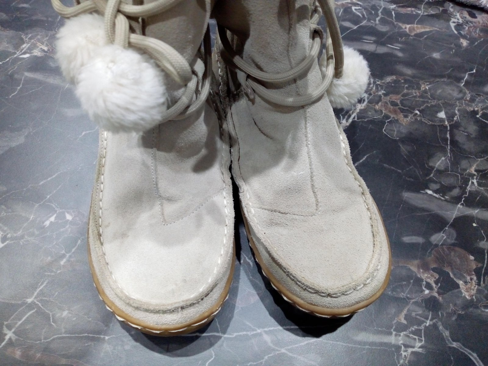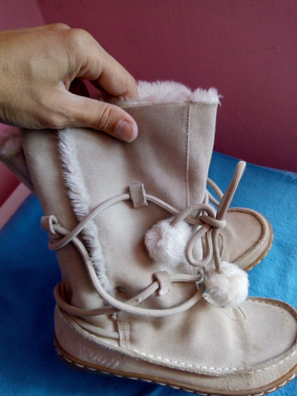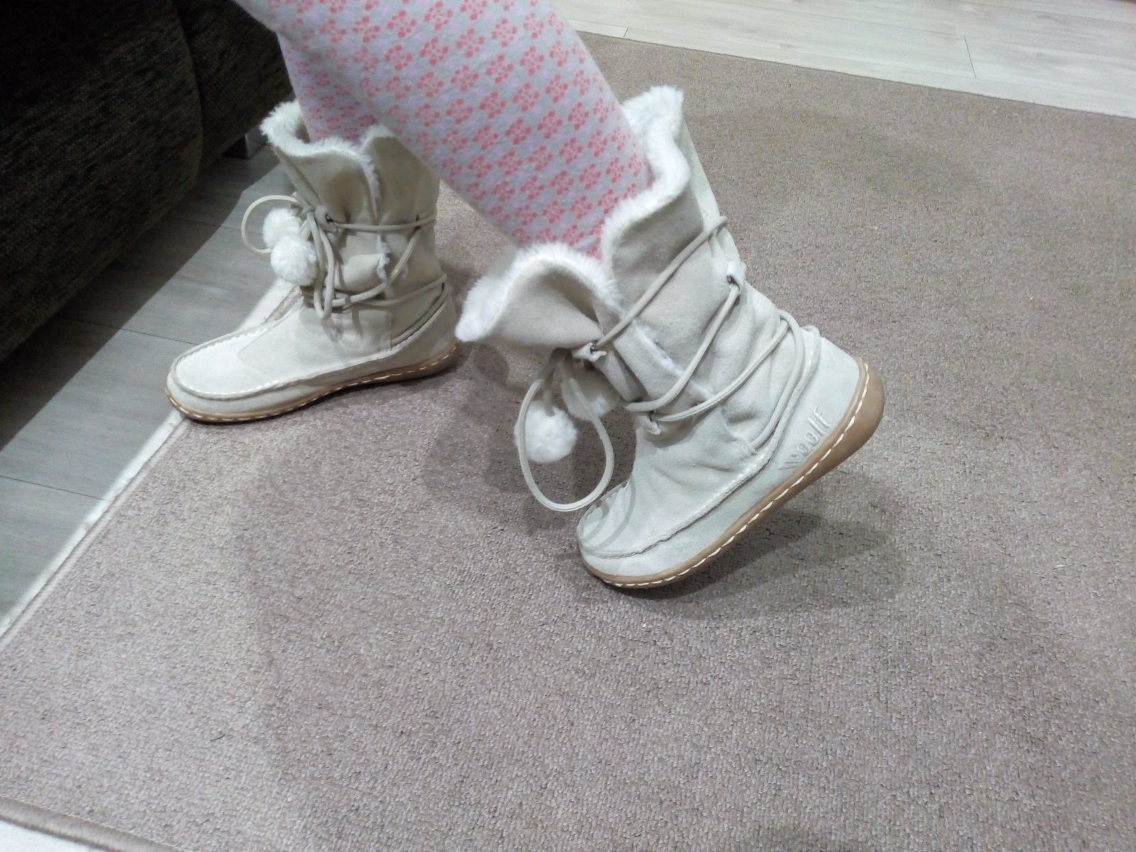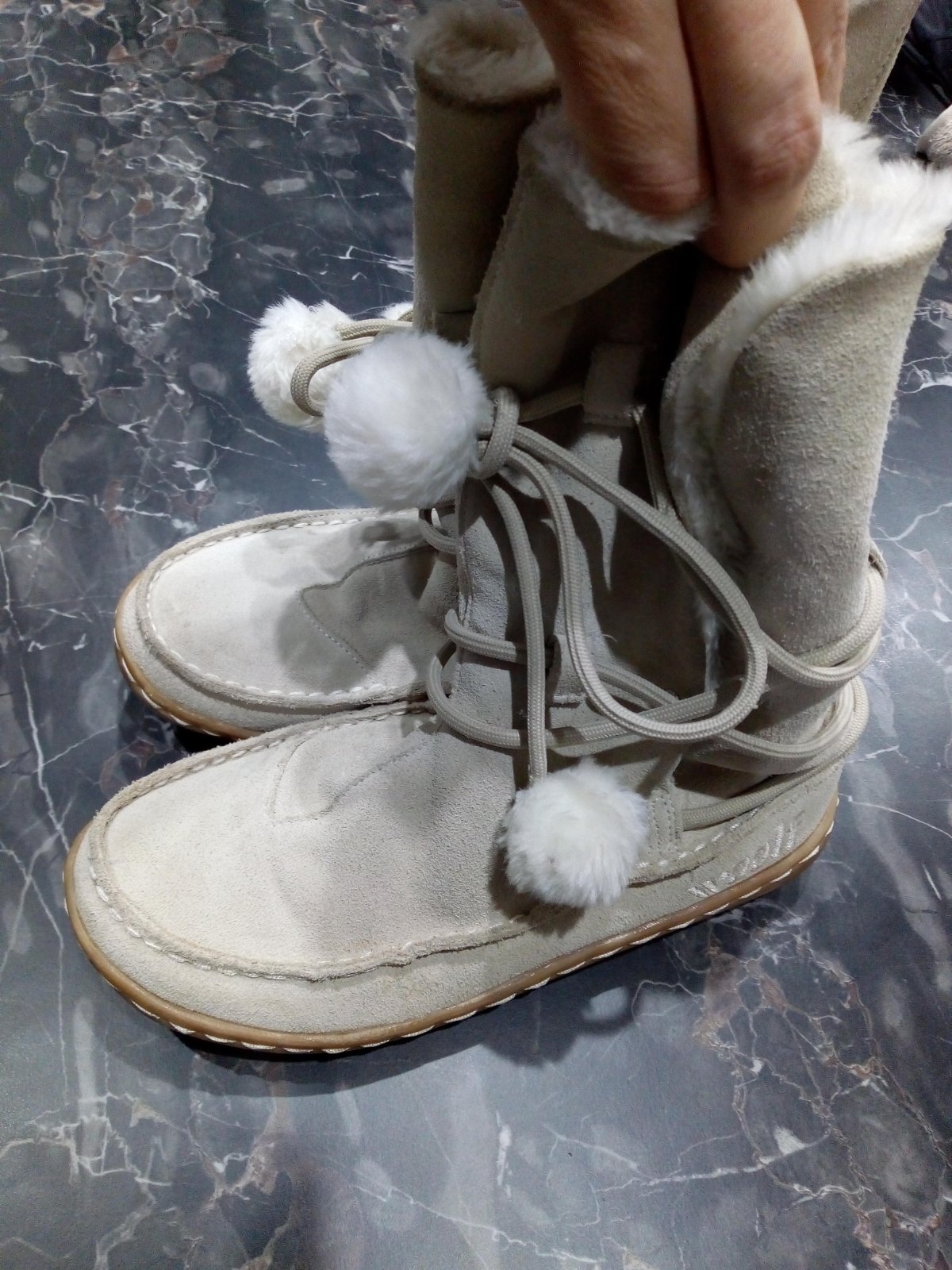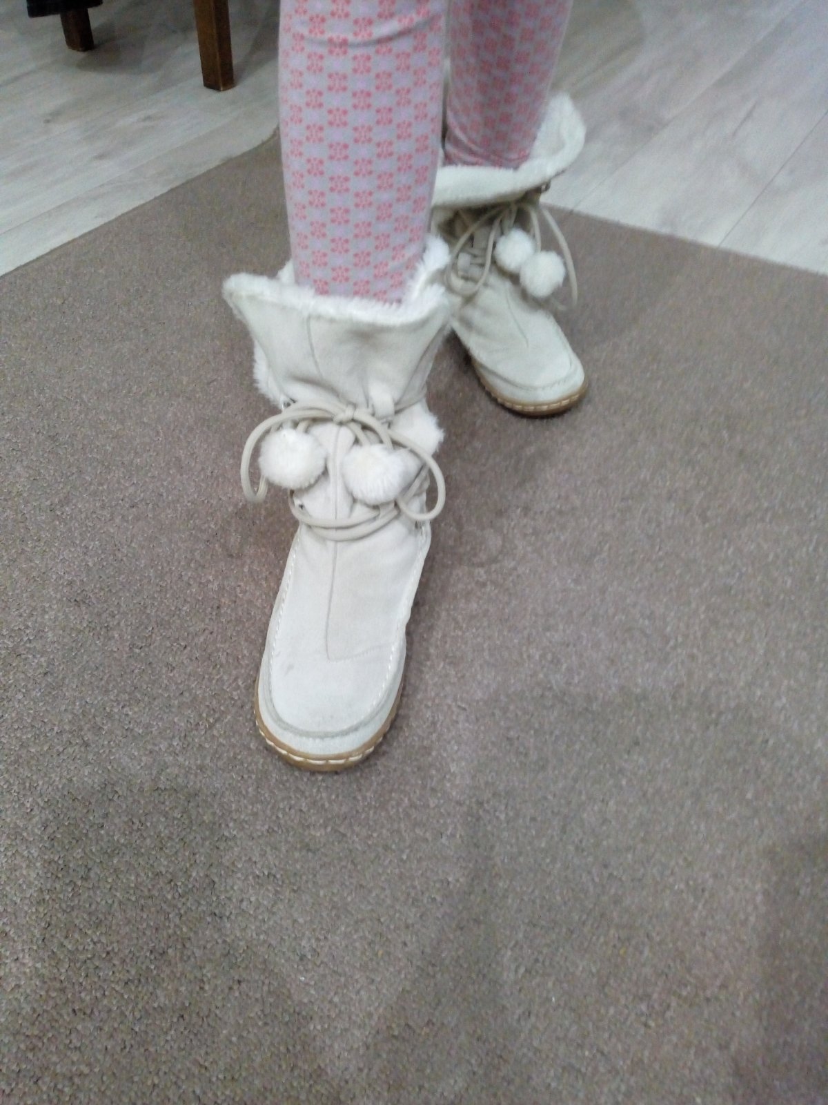 Topánky sú nové. Kúpila som ich v predstihu a boli dcére malé. Vyskúšané iba doma. Teplé. Vnútorná dĺžka na doraz 23,8 cm. To huňaté nie je úplne dole v topánke.
