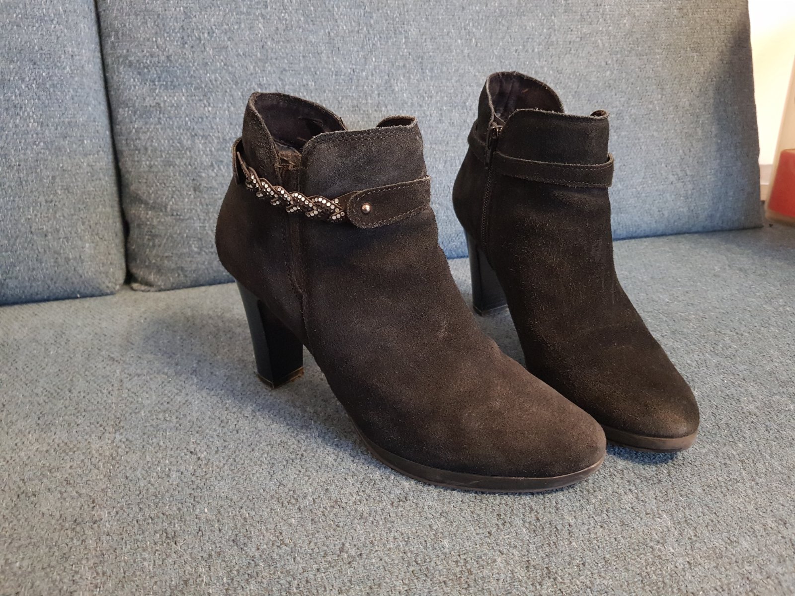 Predám tieto čierne kožené prechodné topánky semišový povrch, nosené, ale v dobrom stave, bez vážnych poškodení, na opätkoch pár škrabancov,ale pekne sa to dá prekryť. Výška opätku 9cm.