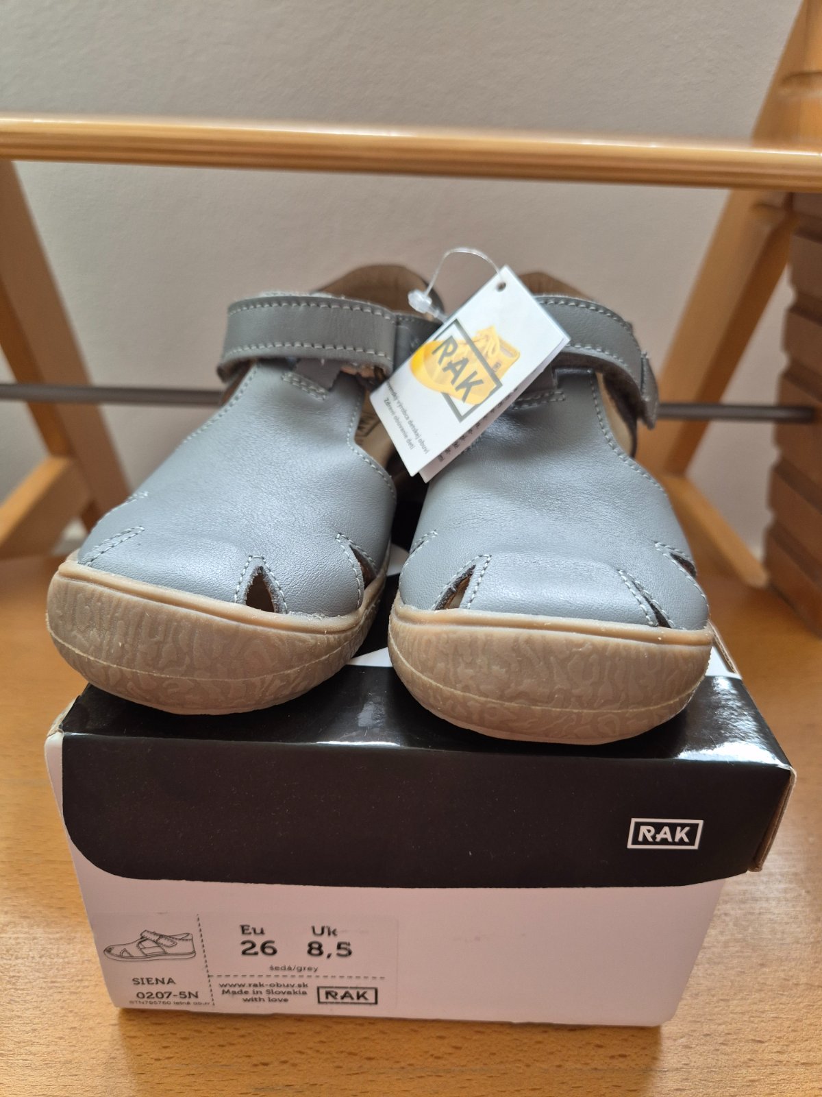 Detská letná obuv sandálkového strihu. Je ľahká, pružná vyrobená z prírodnej kože vrátane podšívky a stielky. Členkový strih, výstuž päty a anatomicky tvarovaná stielka zabezpečia dieťaťu pohodlnú a bezpečnú chôdzu a zohľadňujúc anatomické zvláštnosti detskej nohy aj ich zdravý vývoj. Prekrytie špičky obuvi zvýšeným okrajom podošvy chráni pred vniknutím kamienkov a iných nečistôt do obuvi počas chôdze a zároveň chráni prsty nohy pred prípadným poranením pri zakopnutí. Pri výrobe zvršku obuvi boli použité lepidlá bez obsahu organických rozpúšťadiel. Obuv má certifikát o zdravotnej a hygienickej nezávadnosti.