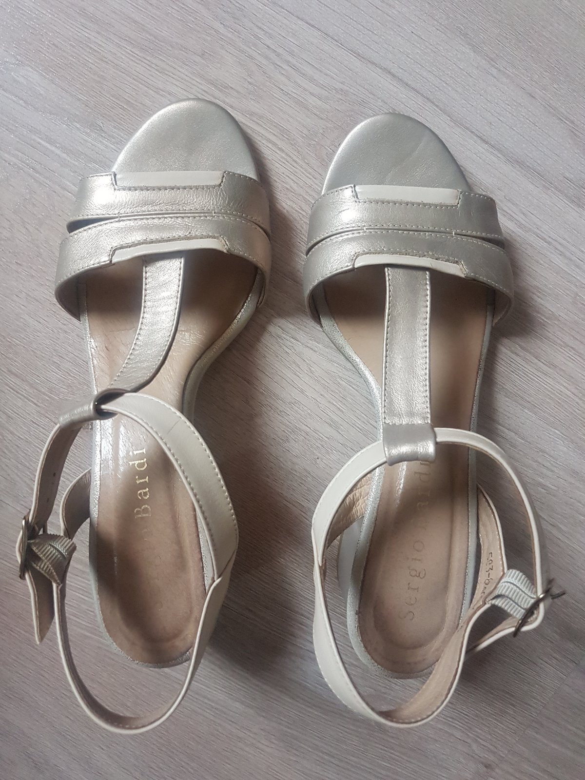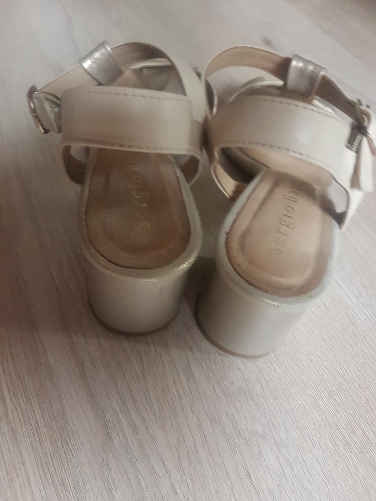Predám kvalitné, veľmi pekné sandálky na opätku, boli len párkrát obuté, sú mäkučké a veľmi pohodlné, na zapínaní je gumička, nemusia sa teda odopínať, značka je Sergio Bardi. Miery sú odfotené. Farba je taká púdrovo-zlatá.
