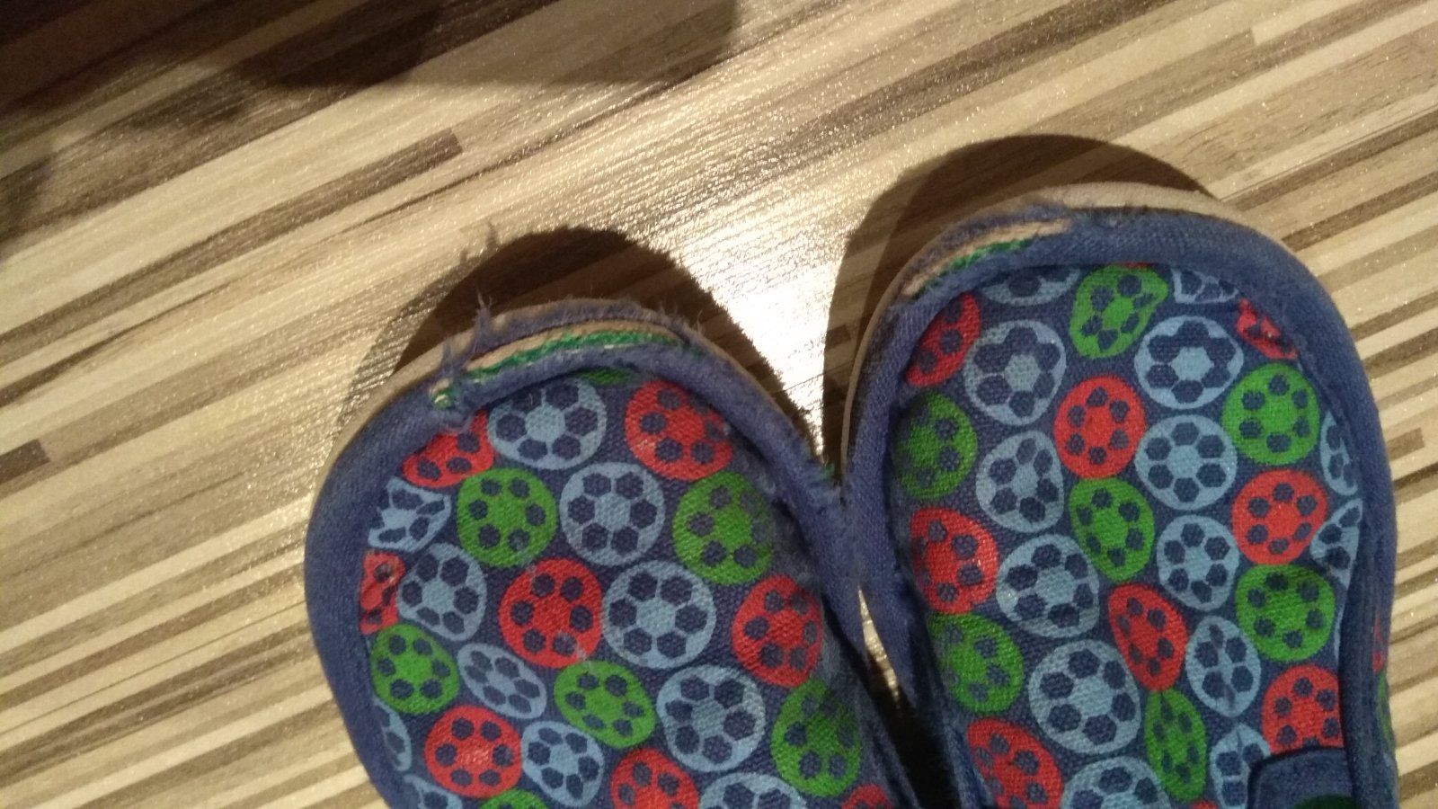 Papučky nosené v škôlke, nie sú zničené, ale vpredu vidieť trosku zodratu látku okolo lepacky a predok sa trolinku odliepa. Nebráni to noseniu ani ne deformuje nohu