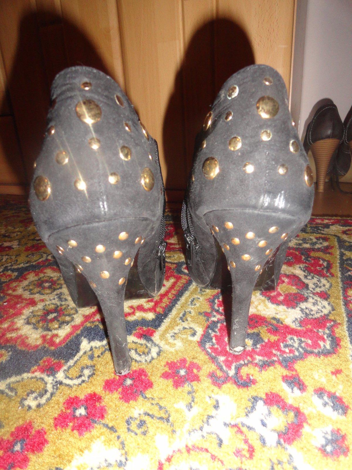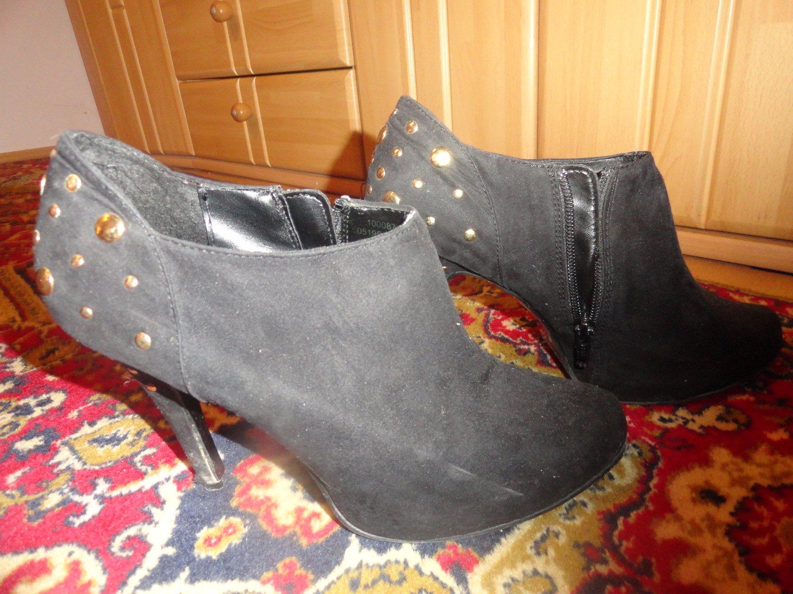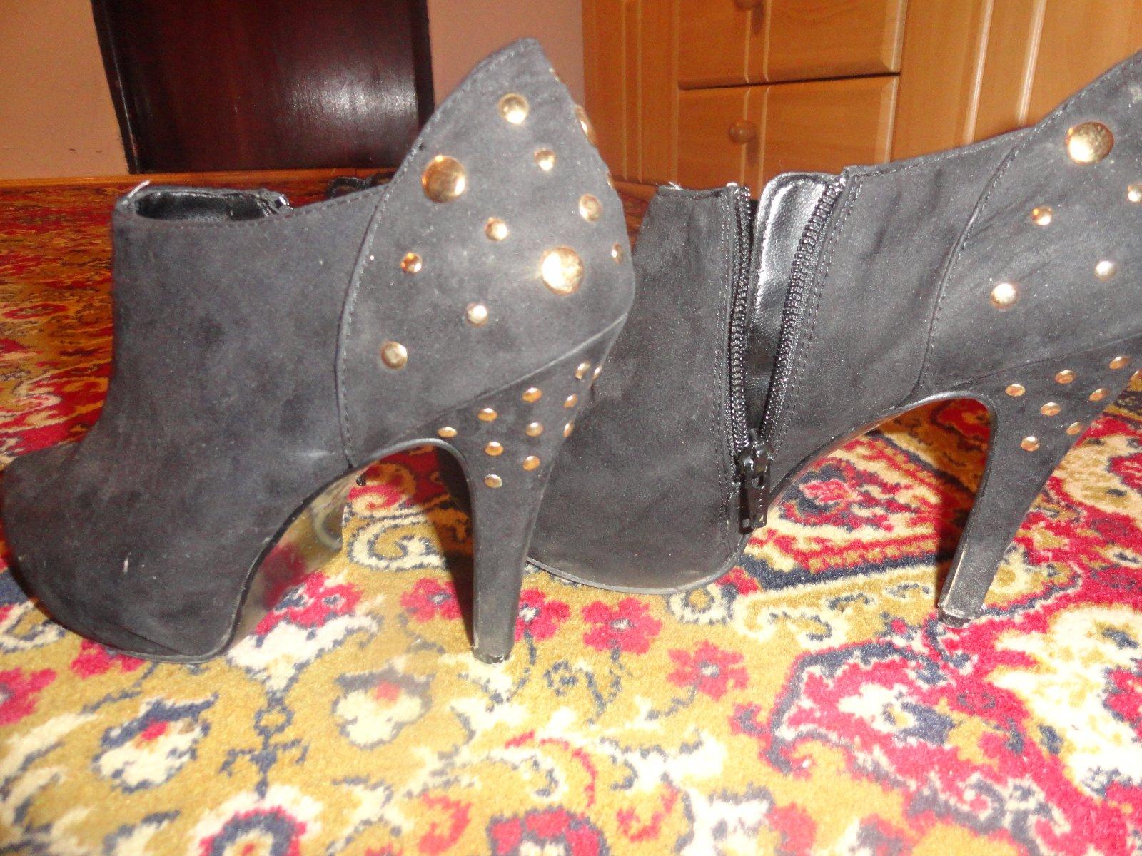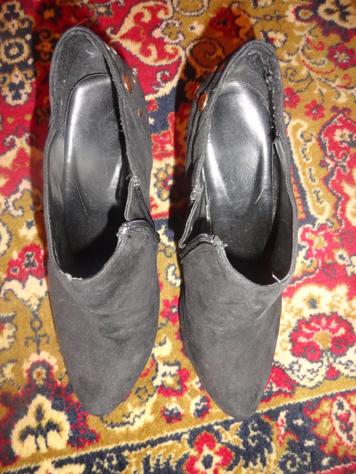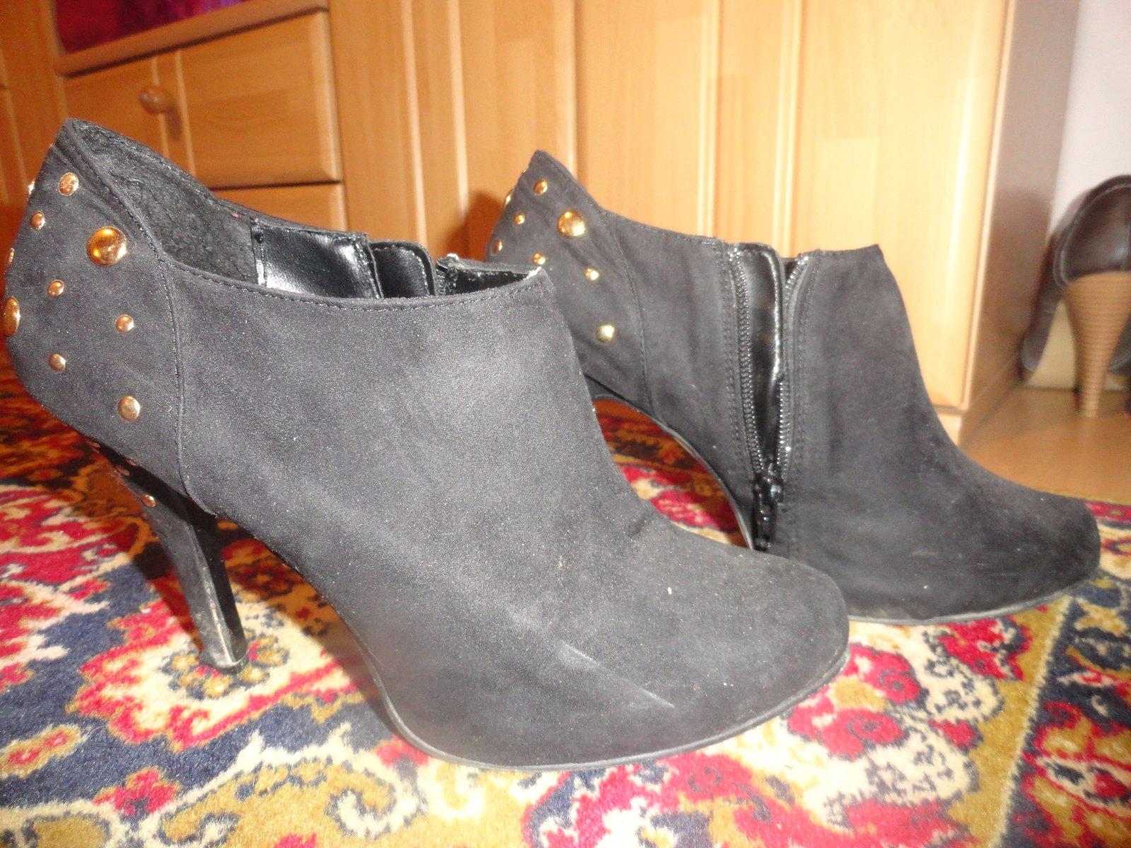 Sýto čierne kotníkové topánočky, foto s bleskom skresľuje. Materiál je semiš alebo brúsená koža, ni som si istá, kupovala som ich cez internet. Neboli veľmi nosené takže sú zachovalé. Perfektná aplikácia so zlatými guličkami na päte a opätku. Zapínanie na zips zboku.