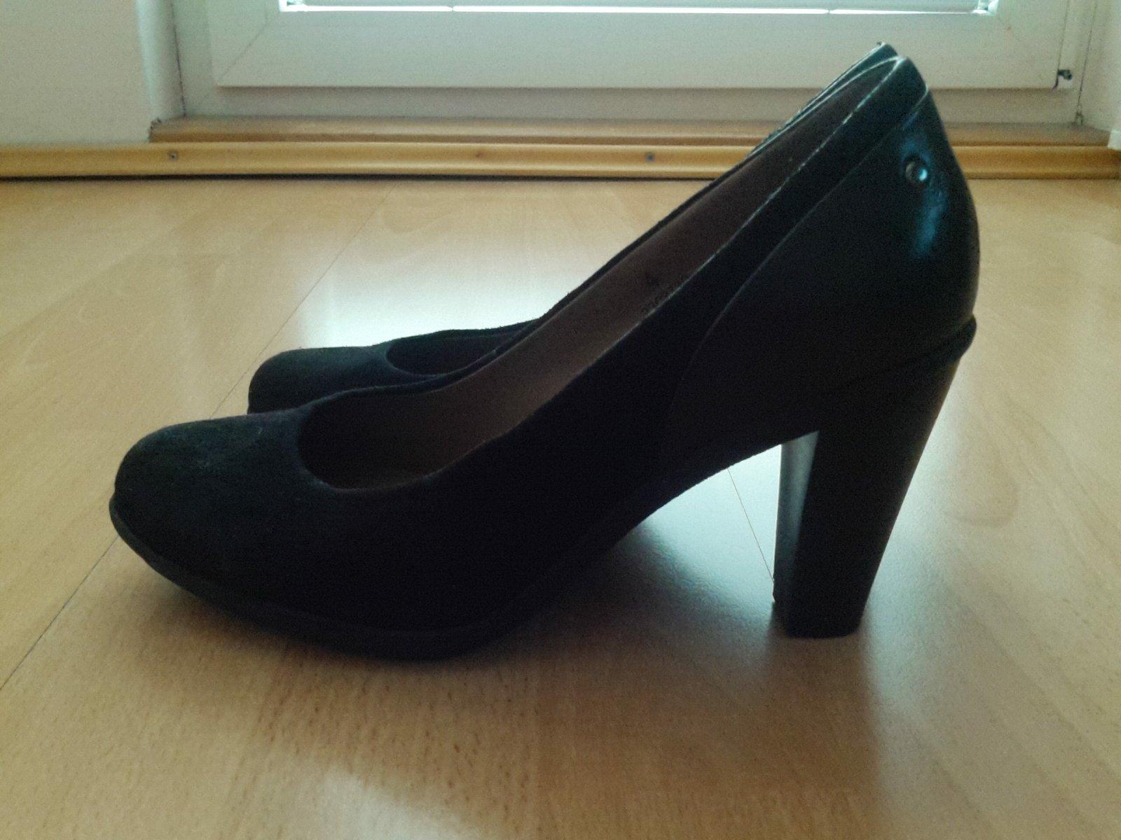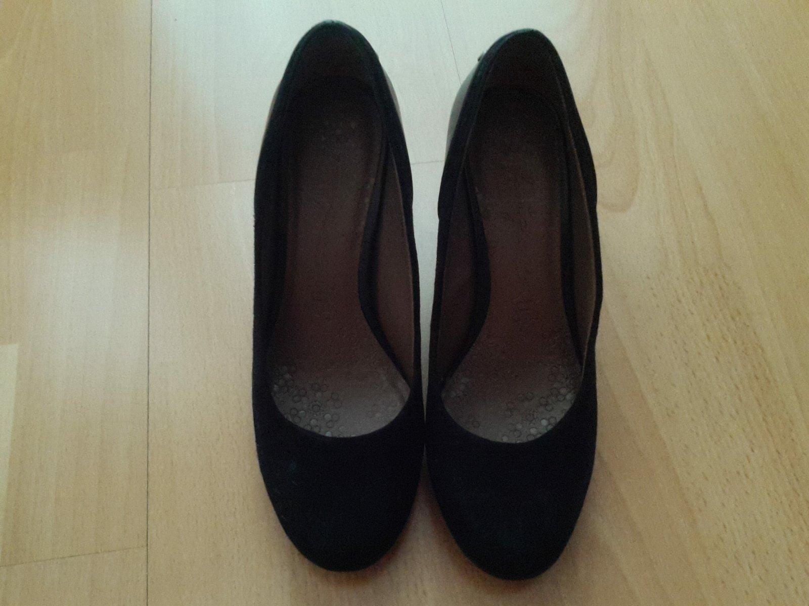 Predam cierne topanky, parkrat obute, velkost neuvadzaju ale podla ostatnych je to taka 36 tka. Vnutorna dlzka cca 24 cm. Opatok 8 cm. Material , brusena koza/ semis. Nad opatkom koza.