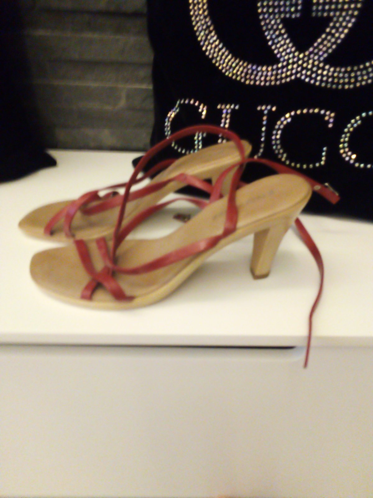 Krasne cervene sandale so strapcami. 1 x obute. Vzadu na zips. Vyska opatku 11cm. Velkost pisana 37, ale sedia na 38. Vnutorna dlzka 24,5 cm, tzn. velkost chodidla max 24 cm. Plus postovne.