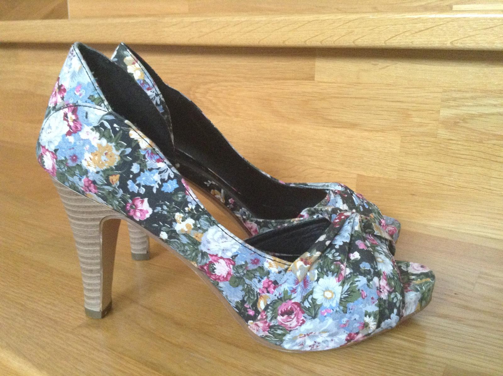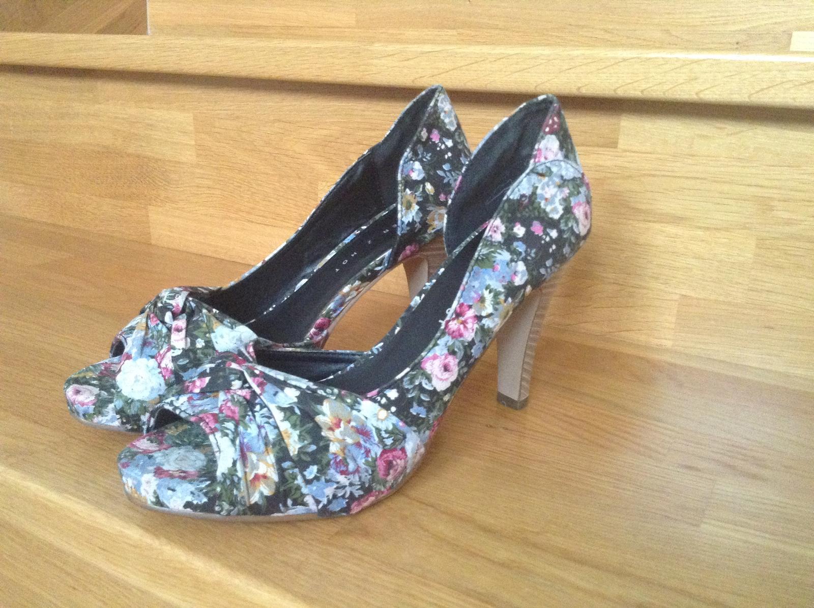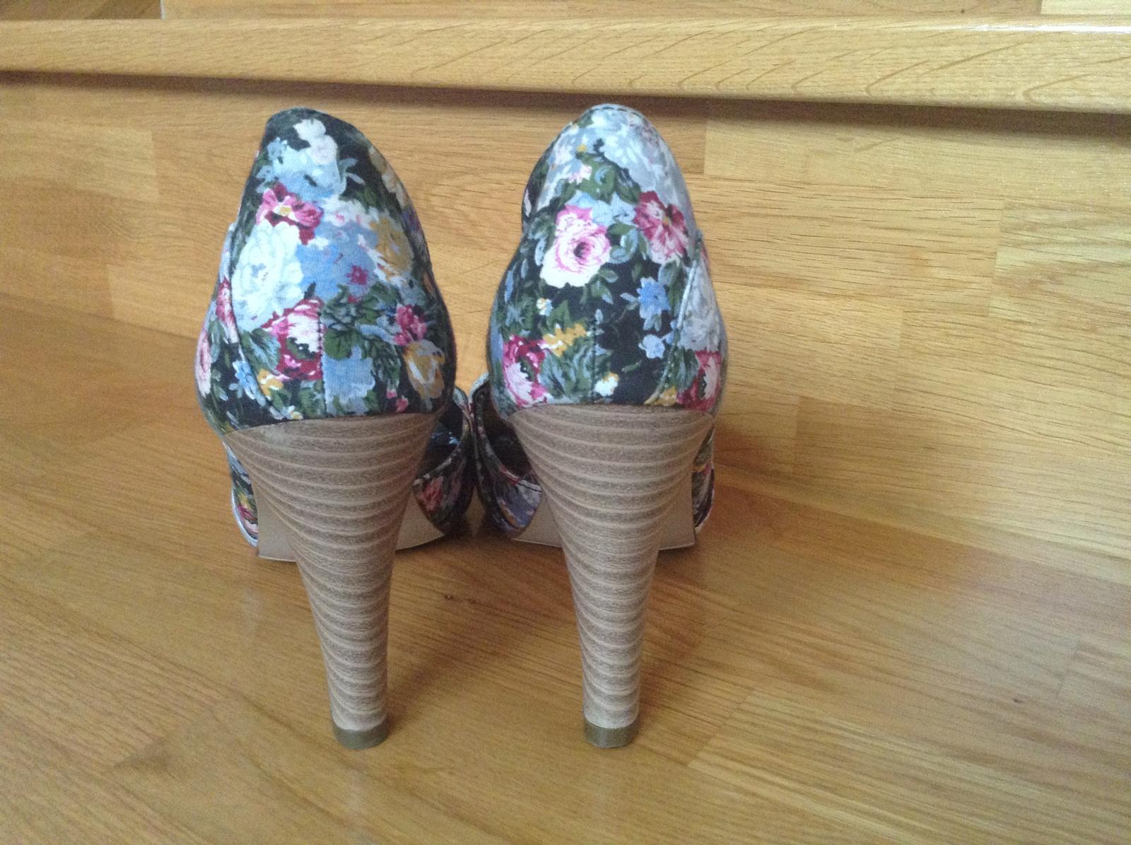 Ponúkam na predaj nove zaujímavé lodičky s motívom kvietkov aj s nálepkou ceny 19.95 pod opätkom s vnútornou dĺžkou 24 cm a výškou opätku 10 cm vo veľkosti 36 . Su absolútne nenosené bez znakov použitia.