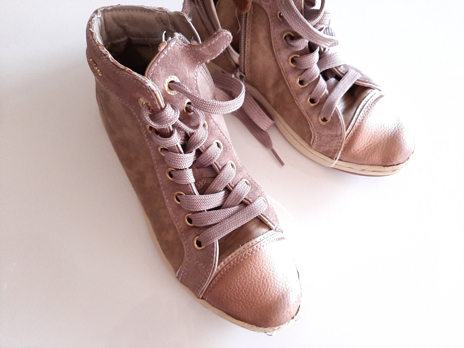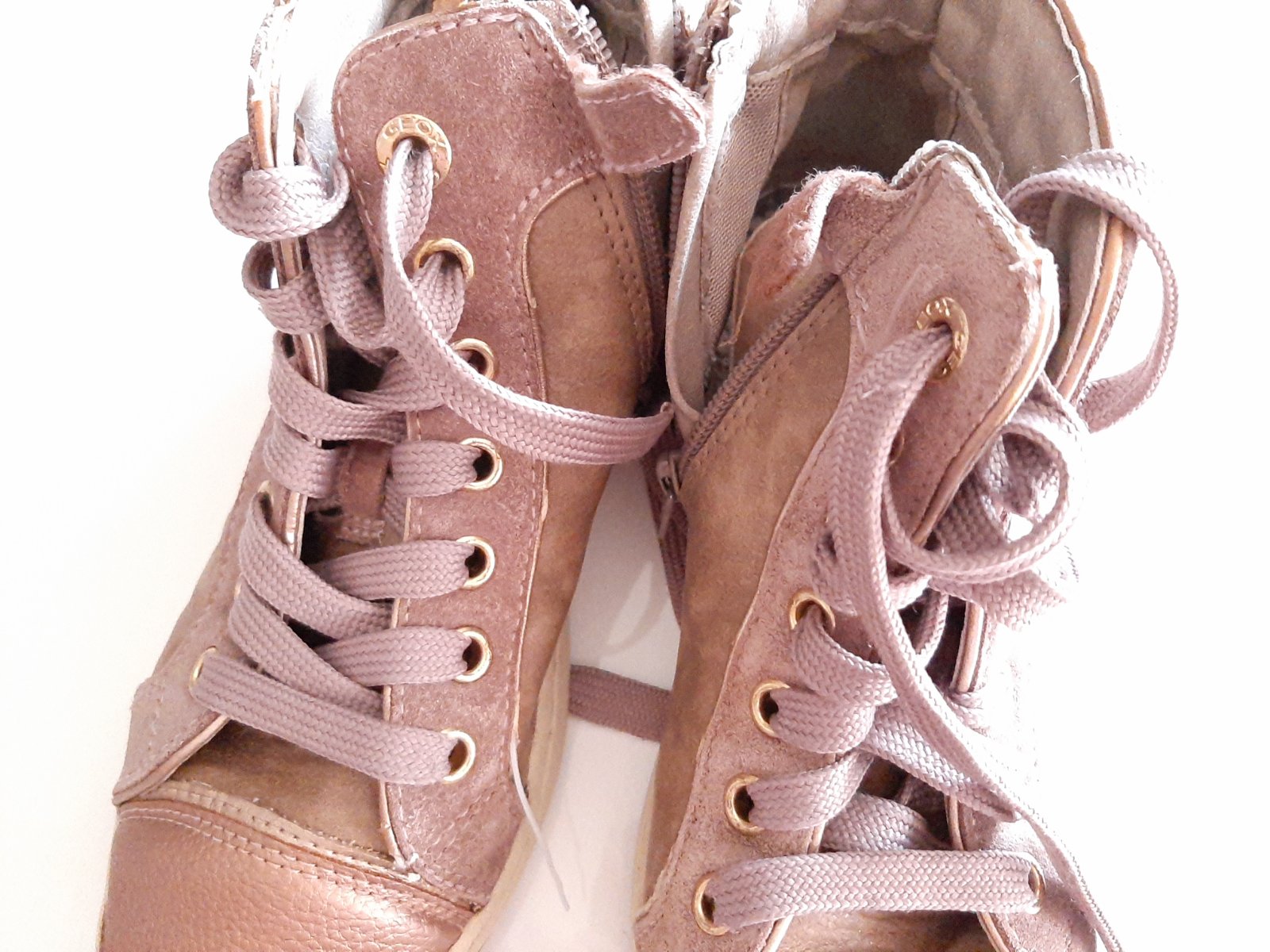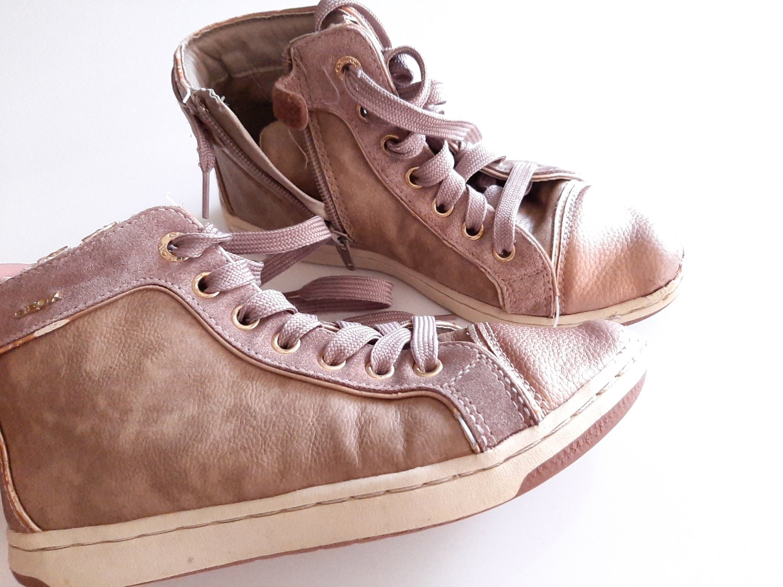 Kvalitné GEOX topánky. Majú známky nosenia (viď. Foto - odretá špička - no nie odlepená, zošúchaná ekokoža na päte pri nápise GEOX, malé vydratie vo vnútri na päte), suché zipsy držia dobre. Po dvo...