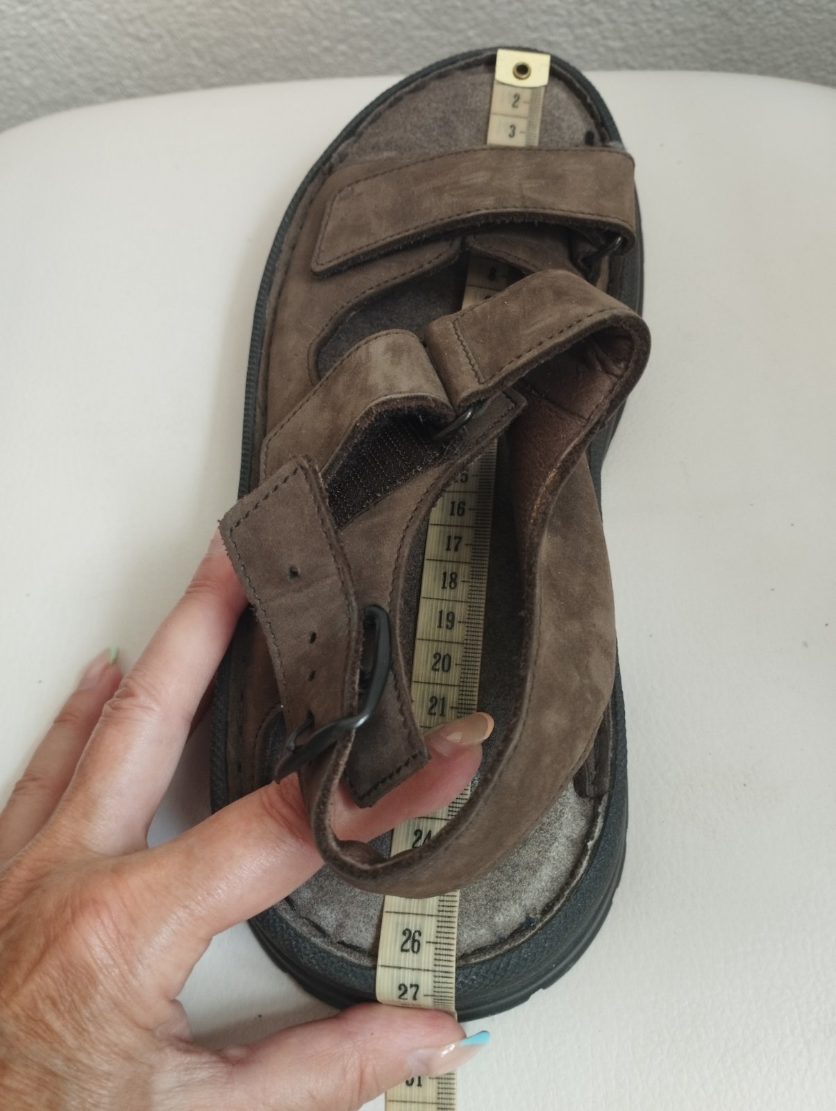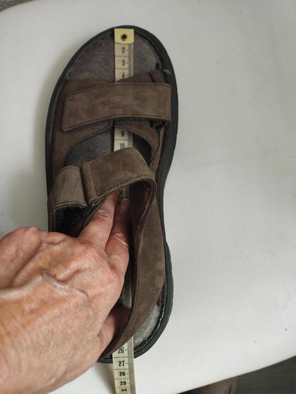 Pánske sandále. Na užšiu nohu. Regulovať sa dá na suchý zips. Brúsená koža. Veľmi zachovalé. V skutočnosti krajšia farba /horká čokoláda/.
