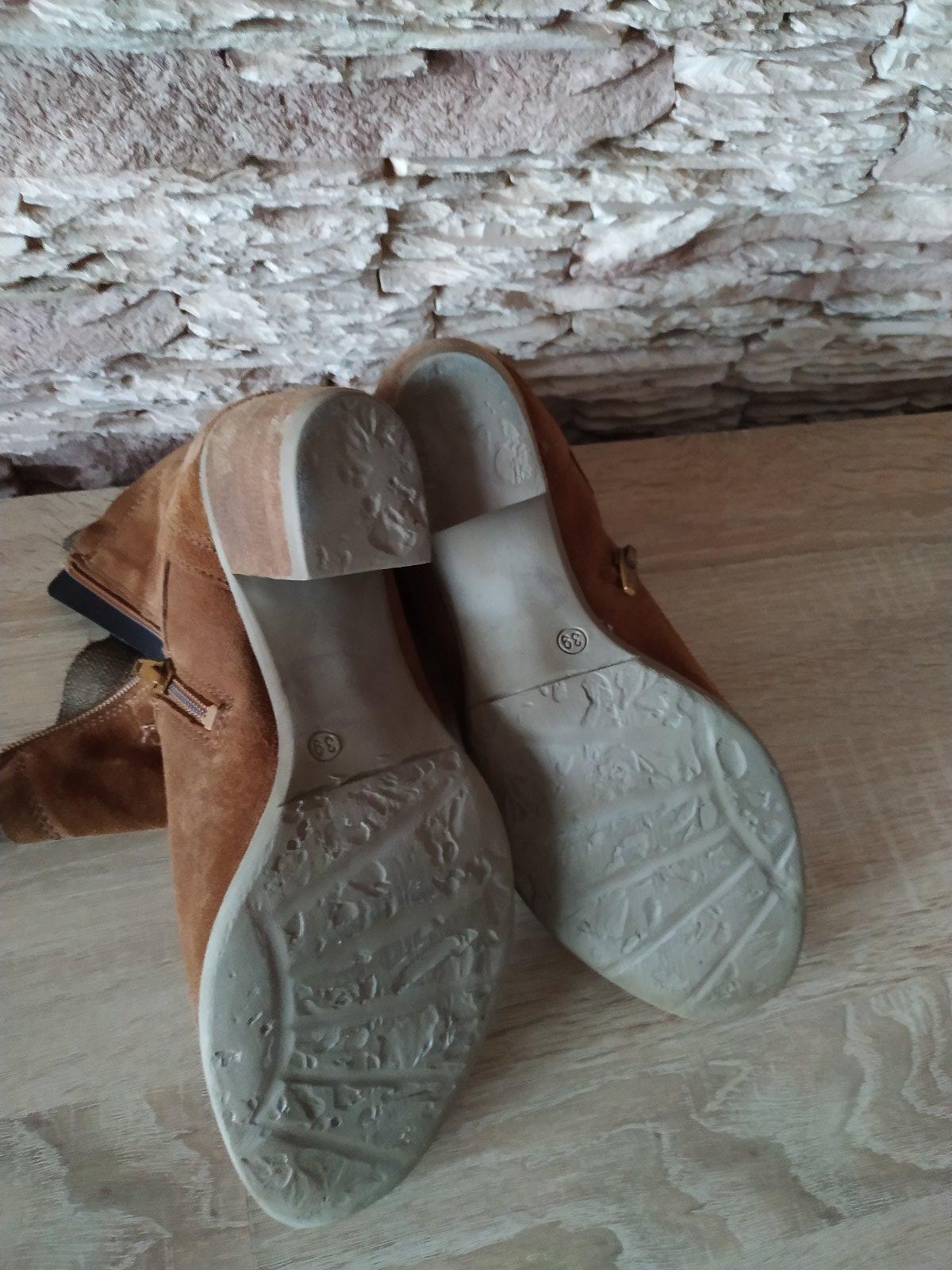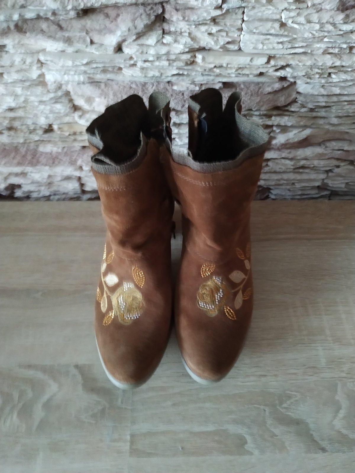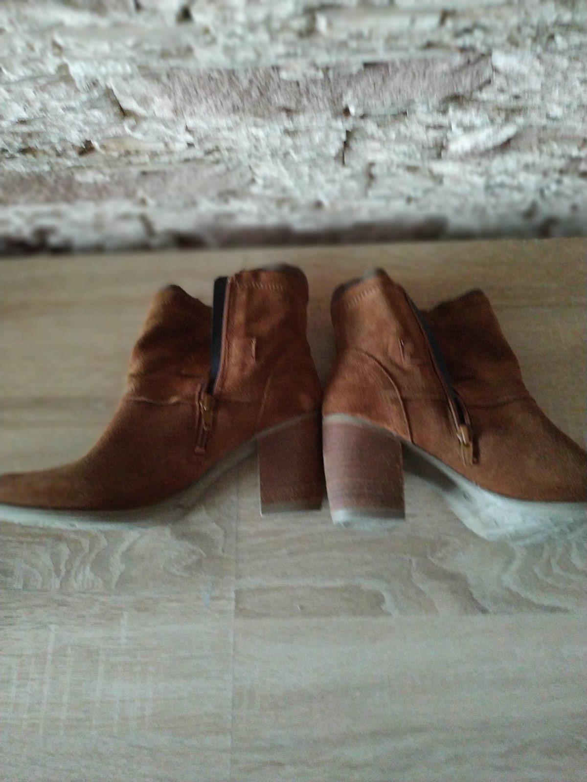 Dámske semišové kotníkové čižmičky hnedo škoricovej farby. Málo nosené. Výška podpätku 7,5cm. Zapínanie na zips. V cene nie je poštovné.