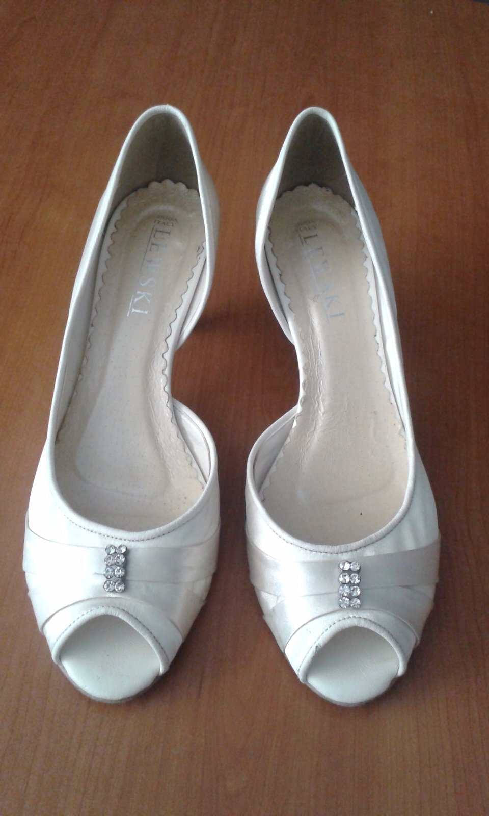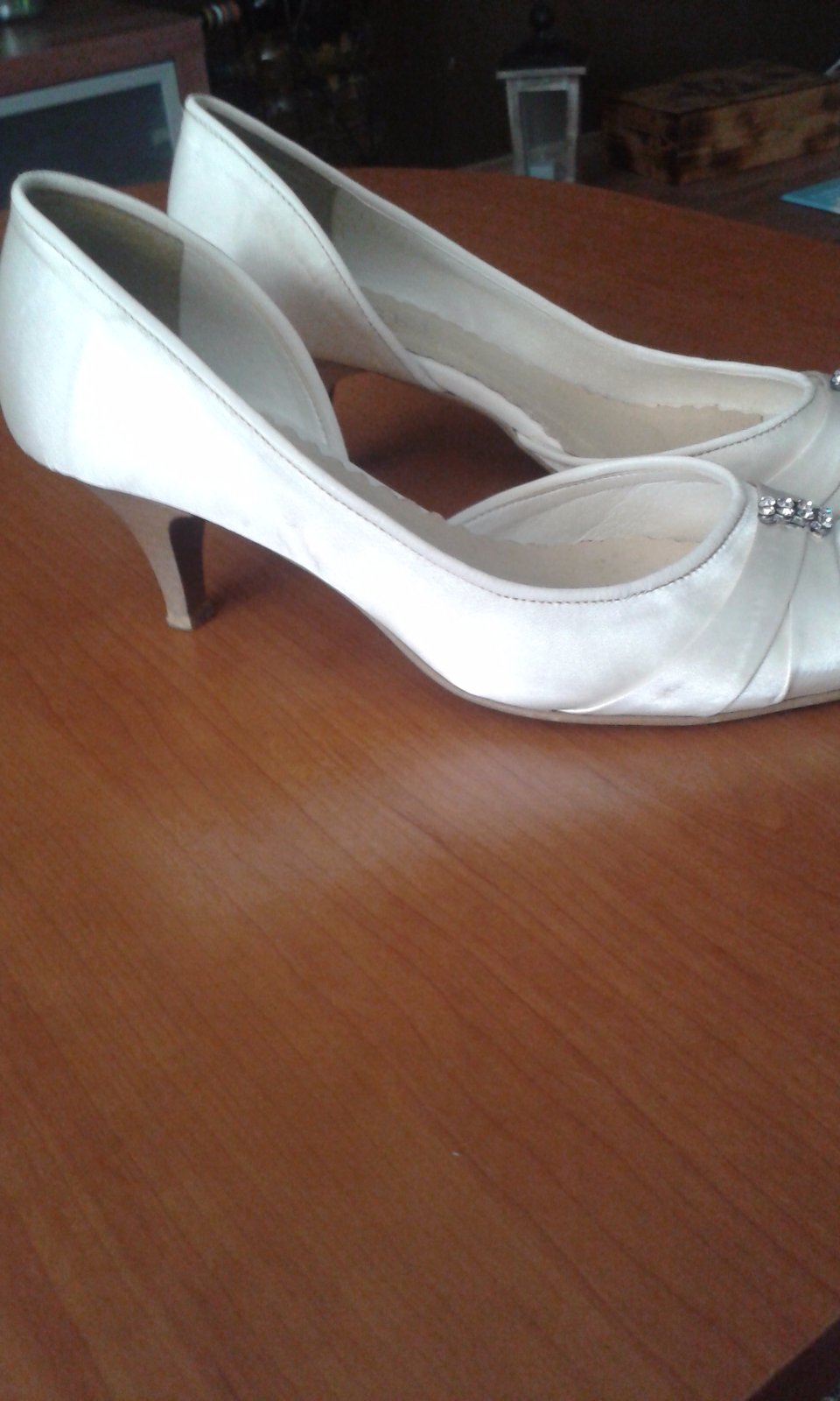 Lodičky sú nové, iba vyskúšané, vnútorná dĺžka 26cm, ja mám nohu 25,5cm a sú mi akurát, výška opätku je 10cm, smotanovej farby, ako na hlavnej foto.