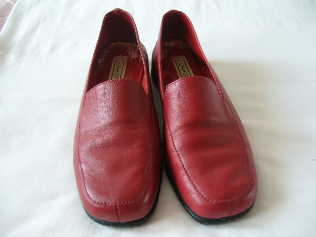 pohodlne mäkke kožene topanky bez poskodenia. Akurat vnutri je trosku oškreta farba na stielke, lebo som tam mala nalepene vložky. Ale na funkcnosti to nic nemeni. Vyska opätku 2,8cm. Vnutorna dlzka 25,5cm. Farba vinovo cervena.
