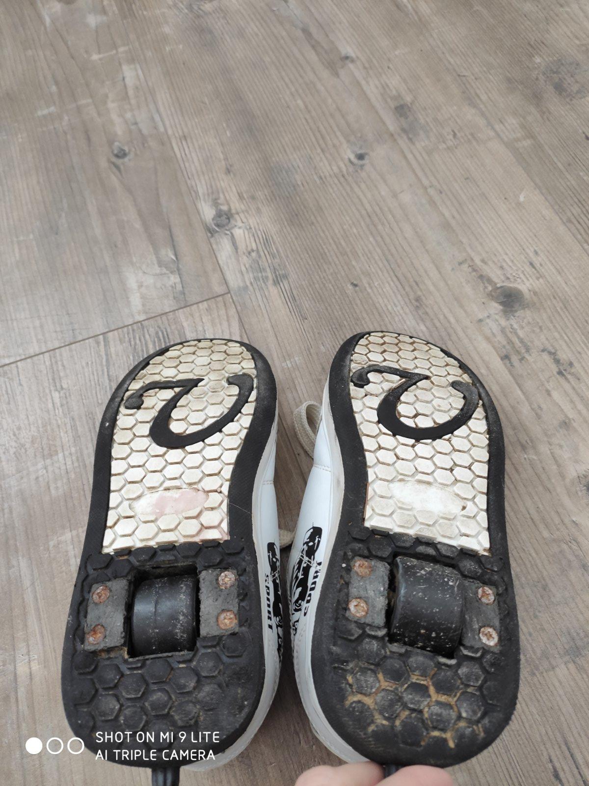 nosene tenisky na kolieskach. kolieska sa daju samozrejme zatlacit a daju sa vyuzivat ako bezne tenisky. velkost 32. na zadnej strane nad patou chyba na jednej napis vid. fotky . su nosene takze treba popozerat fotky kvoli stavu .