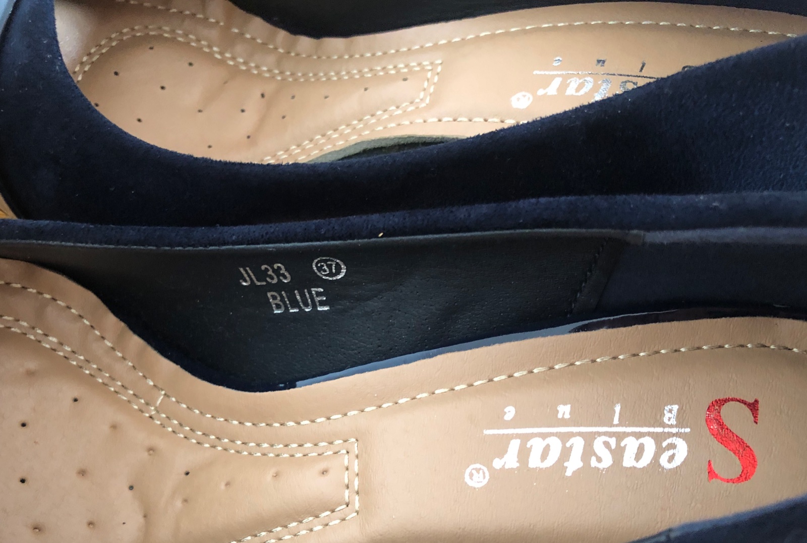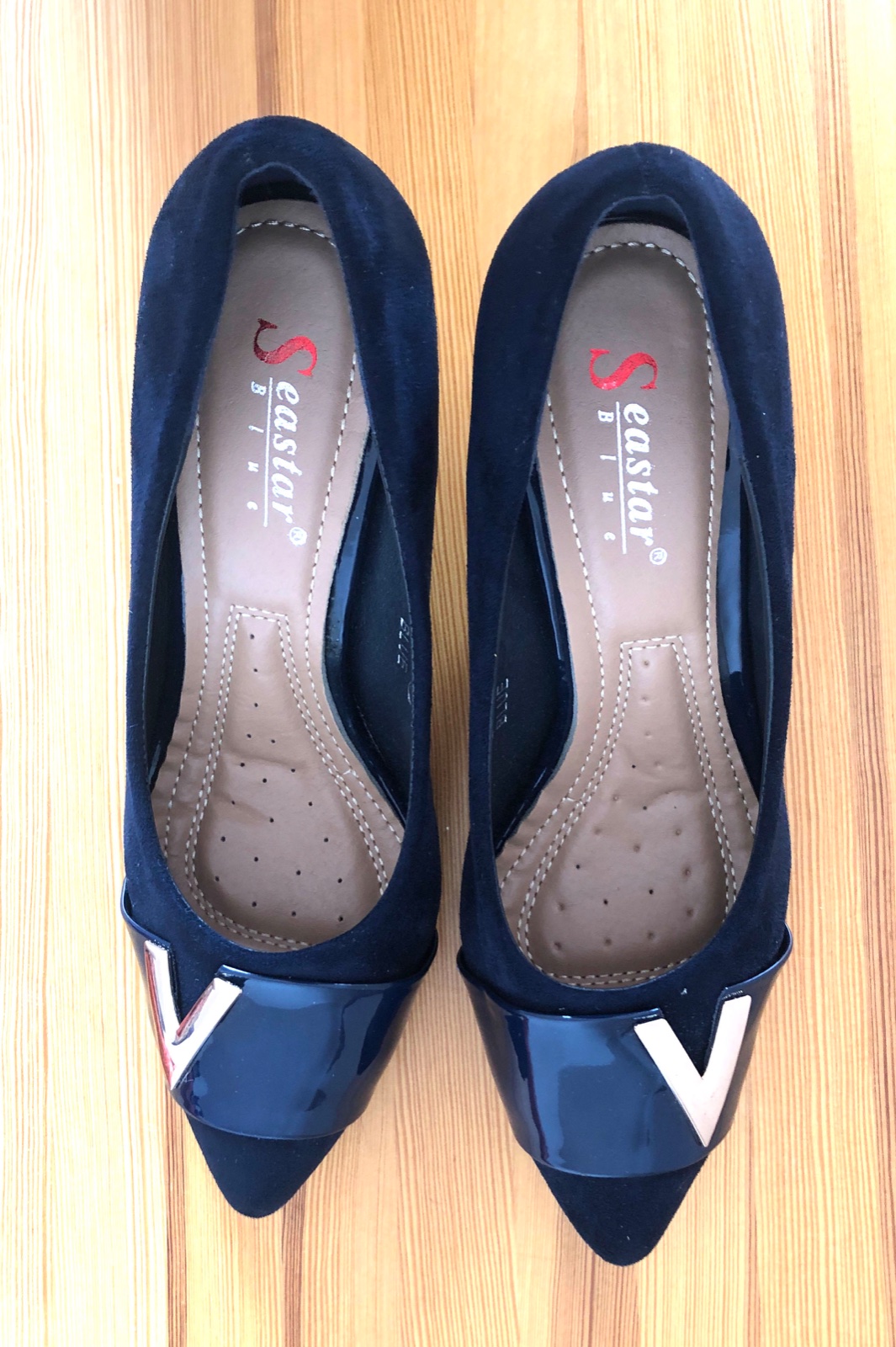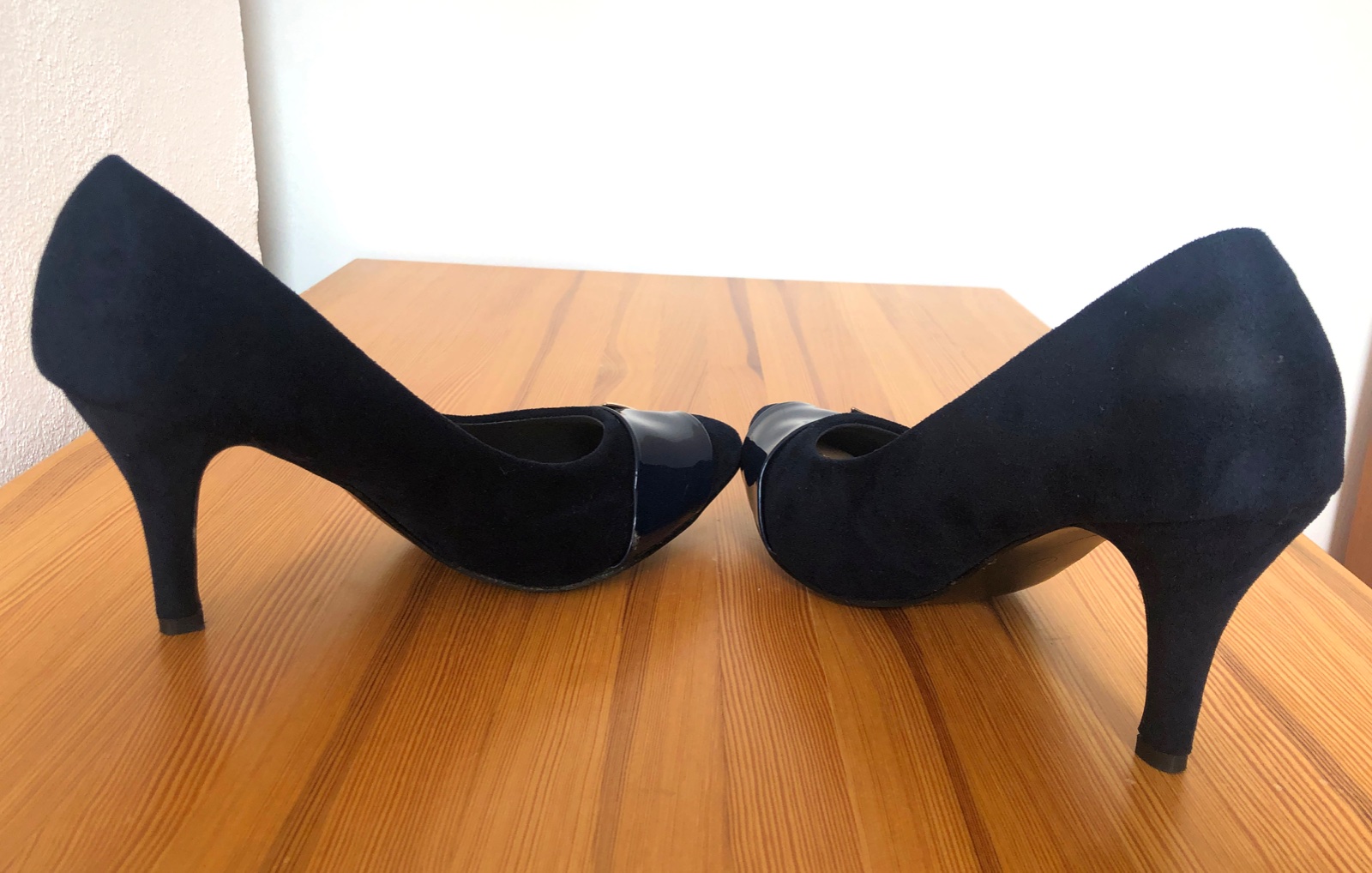Tmavomodré semišové lodičky kombinované s lesklou časťou vpredu a zlatým doplnkom. Nie sú veľmi vysoké a majú mäkkú výstielku, takže sú veľmi pohodlné. Neboli nikdy nosené.