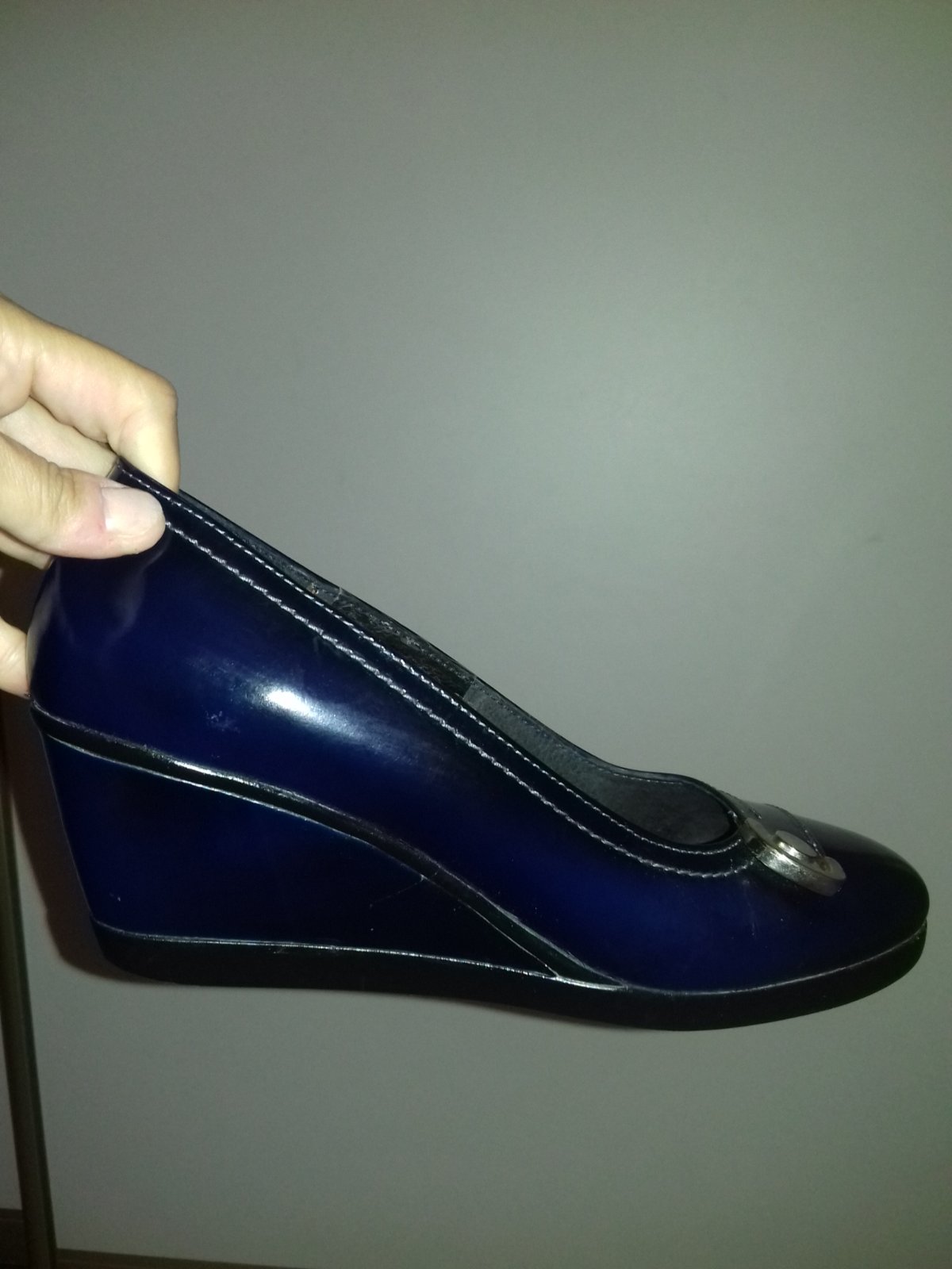 Nenosene tmavomodre kozene lakovane topanky na ciernom klinku. Moznost k nim prikupit tmavomodru kabelku z ekokoze zn.pierre cardin za 12e.