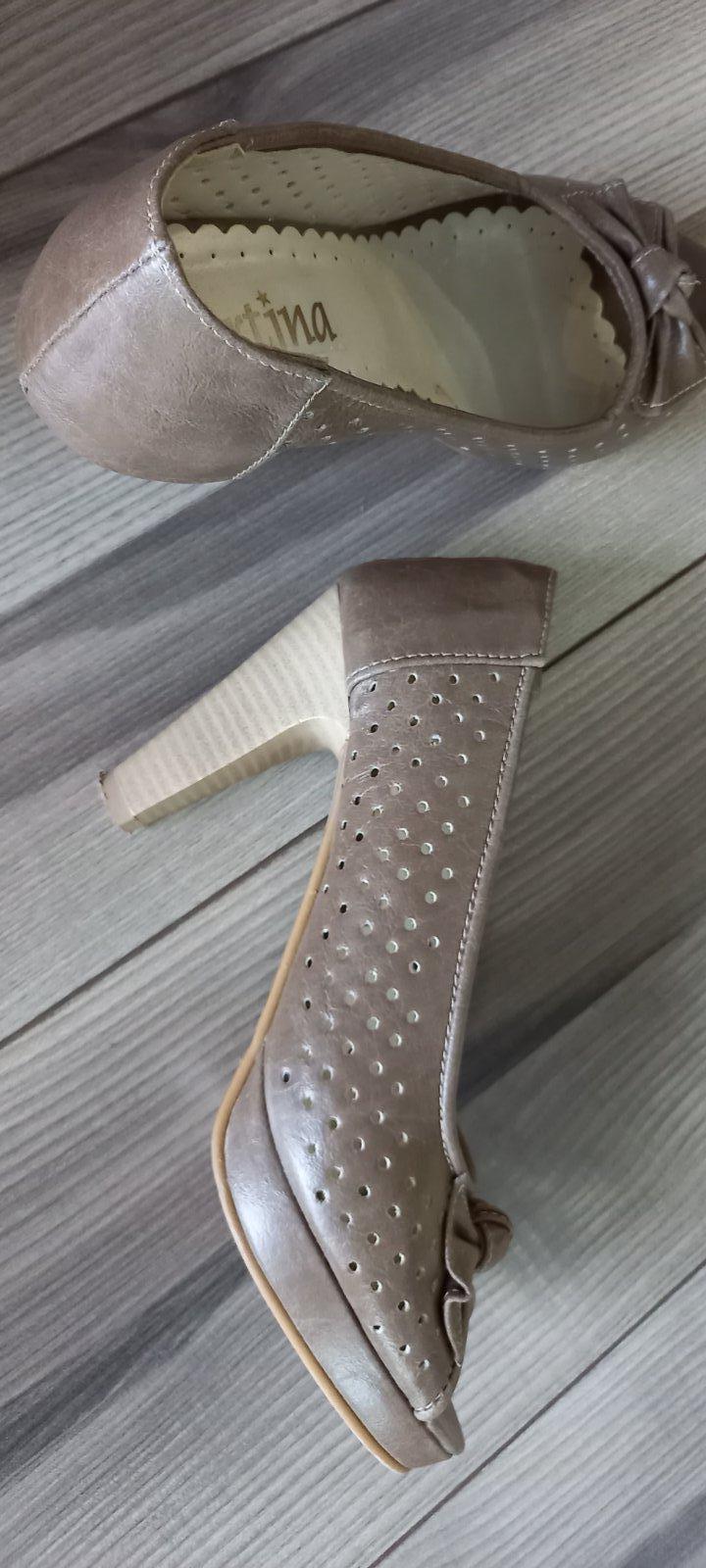 Kožené lodičky, málo nosené, s otvorenou špičkou, vpredu mašlička, pohodlné, opätok 8 cm, vnútro 23,5 cm.