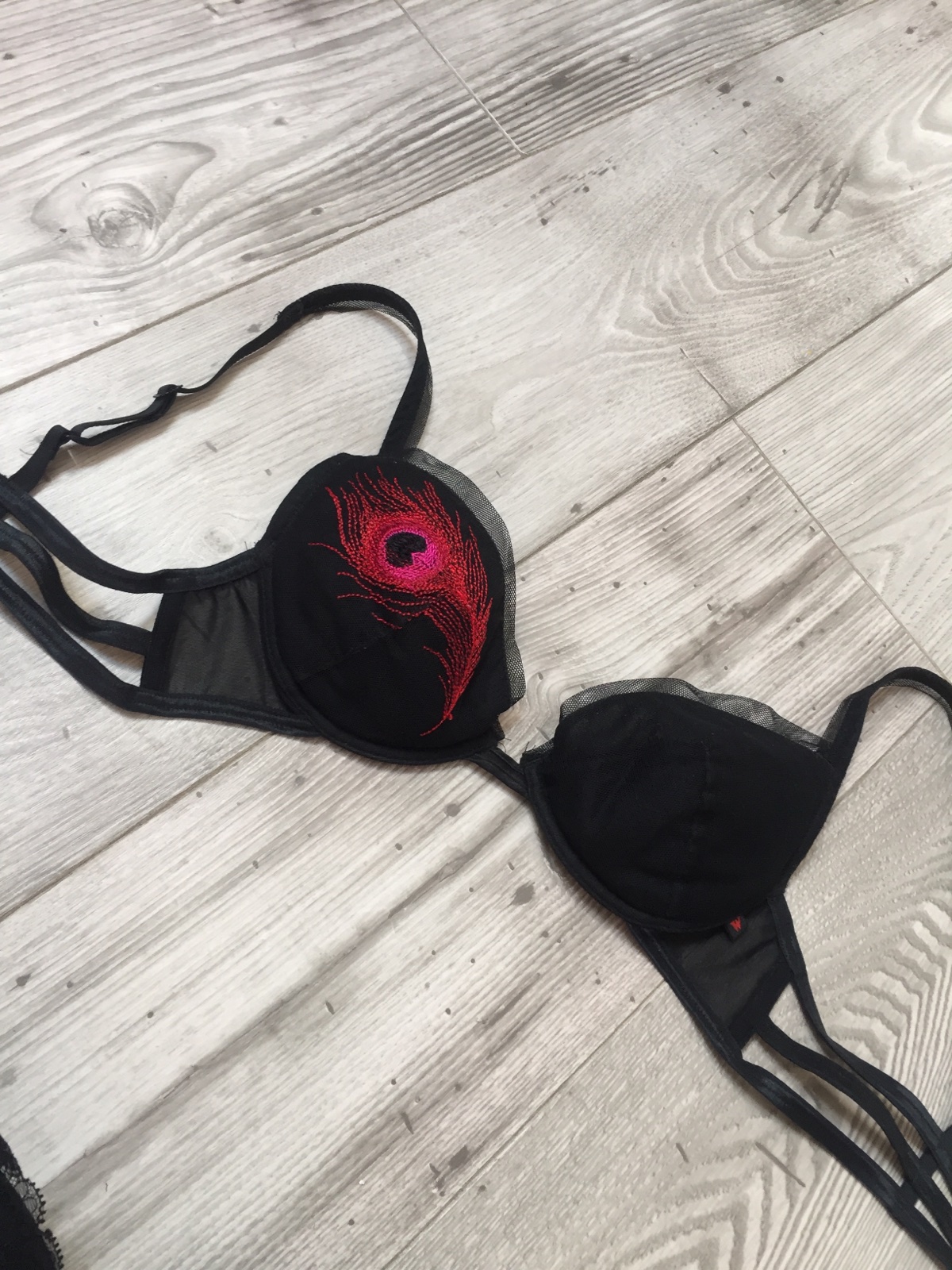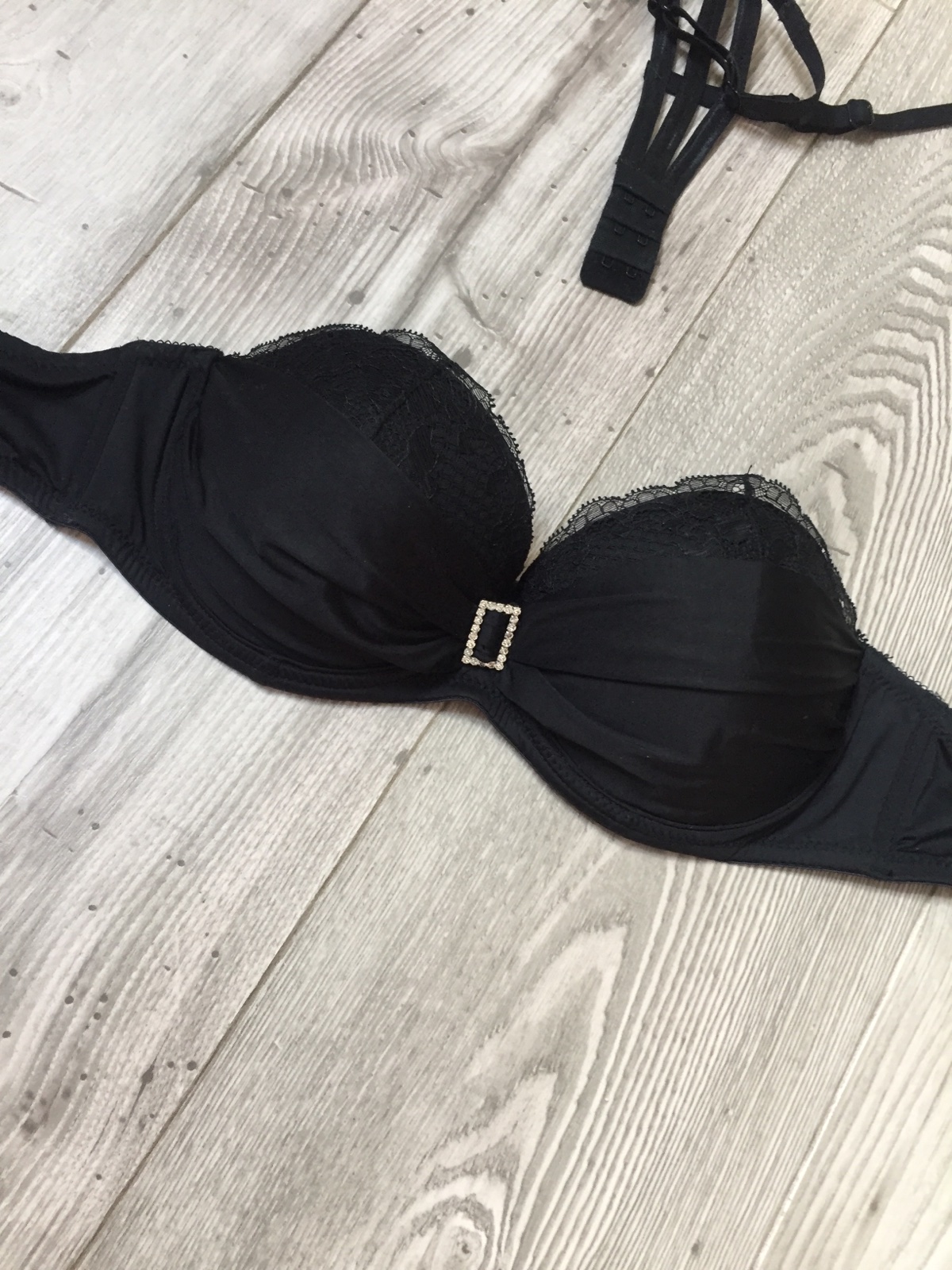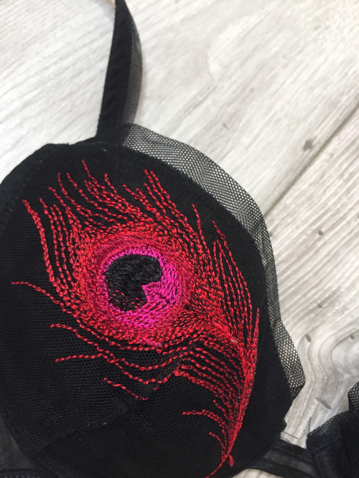 Čierna podprsenka so vzorom jemných bielych bodiek a výraznou výšivkou. Nevystužená, s kosticami.