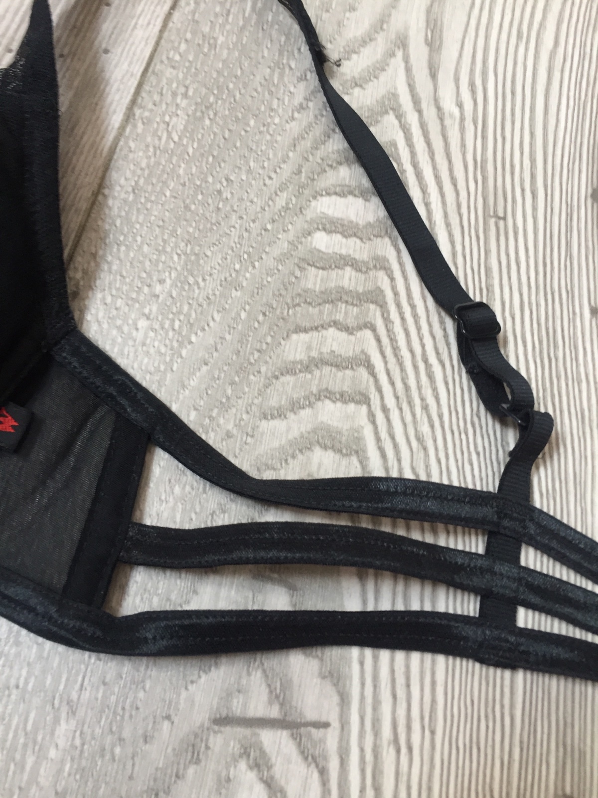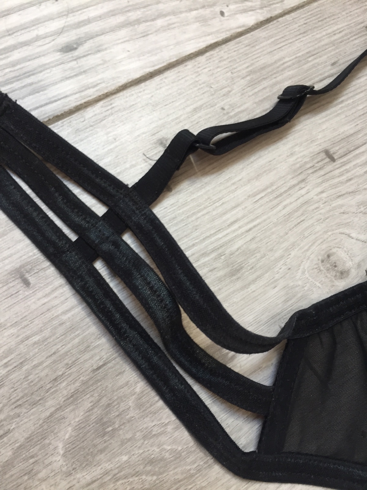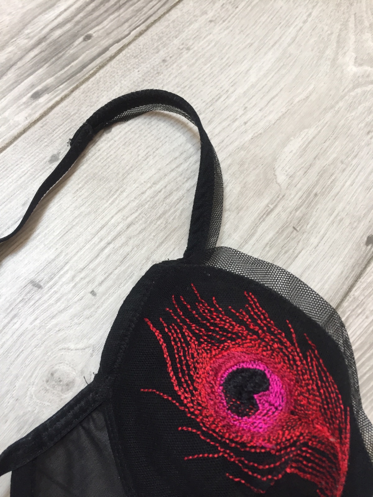 Čierna podprsenka so vzorom jemných bielych bodiek a výraznou výšivkou. Nevystužená, s kosticami.