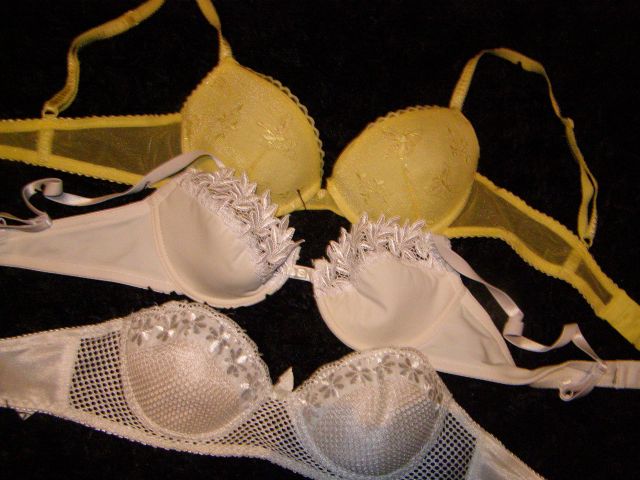 Žlto zlatá podprsenka zn. AMISU, veľkosť S, mierne vystužená - nevynosím, mám toho veľa - mierne čipkové ramienka (množstvo detailov) + 2 biele zakúpené v Prahe , veľkosť S resp. 70B