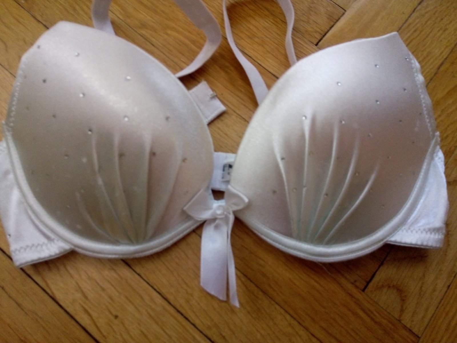Saténova podprsenka zdobená kamienkami v super stave. Mierne vystužená, s kosticami.