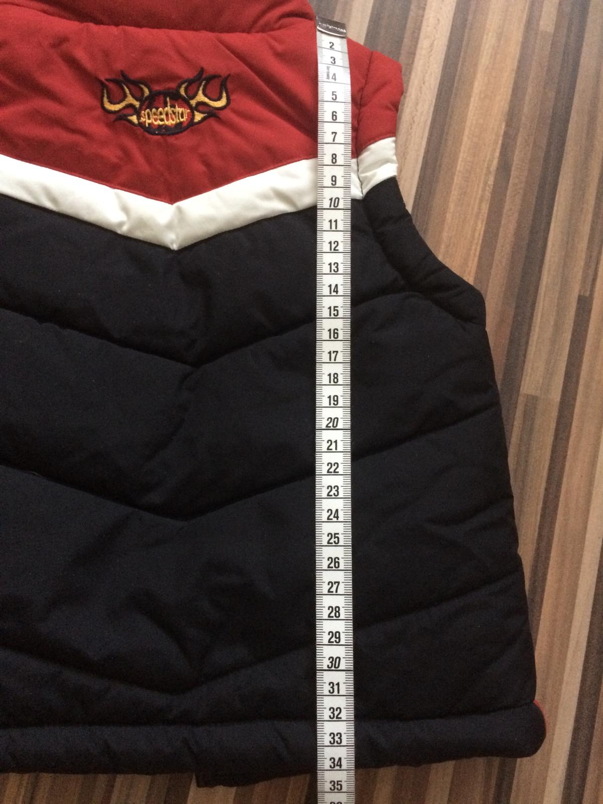 Šírka pod pazuškami 30 cm, celková dĺžka 34 cm. Vo vnútri je zateplená flísom. Červená farba je v skutočnosti bordová