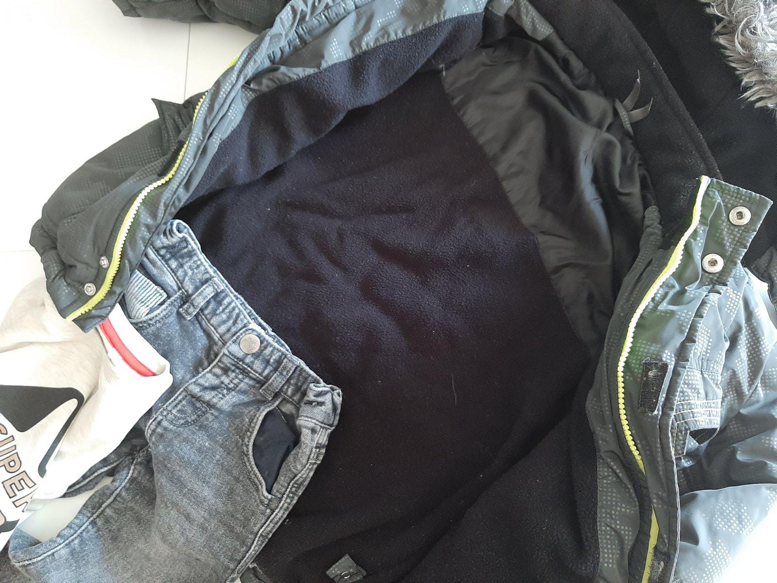 Teplucka bunda. Zips ide lahko. Jedna vada na ľavom rukáve zasivana dierka. Hryzol nás tam psík.