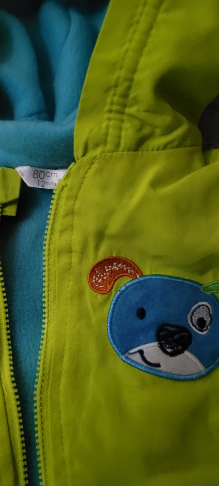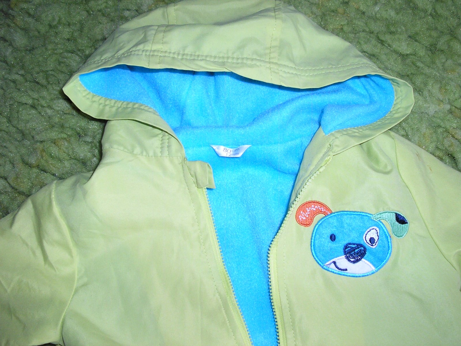 Zeleno-žltý kabátik prechodný s kapucňou, skoro nenosený, ako nový zapínanie na zips, na prednej strane výšivka – maco.