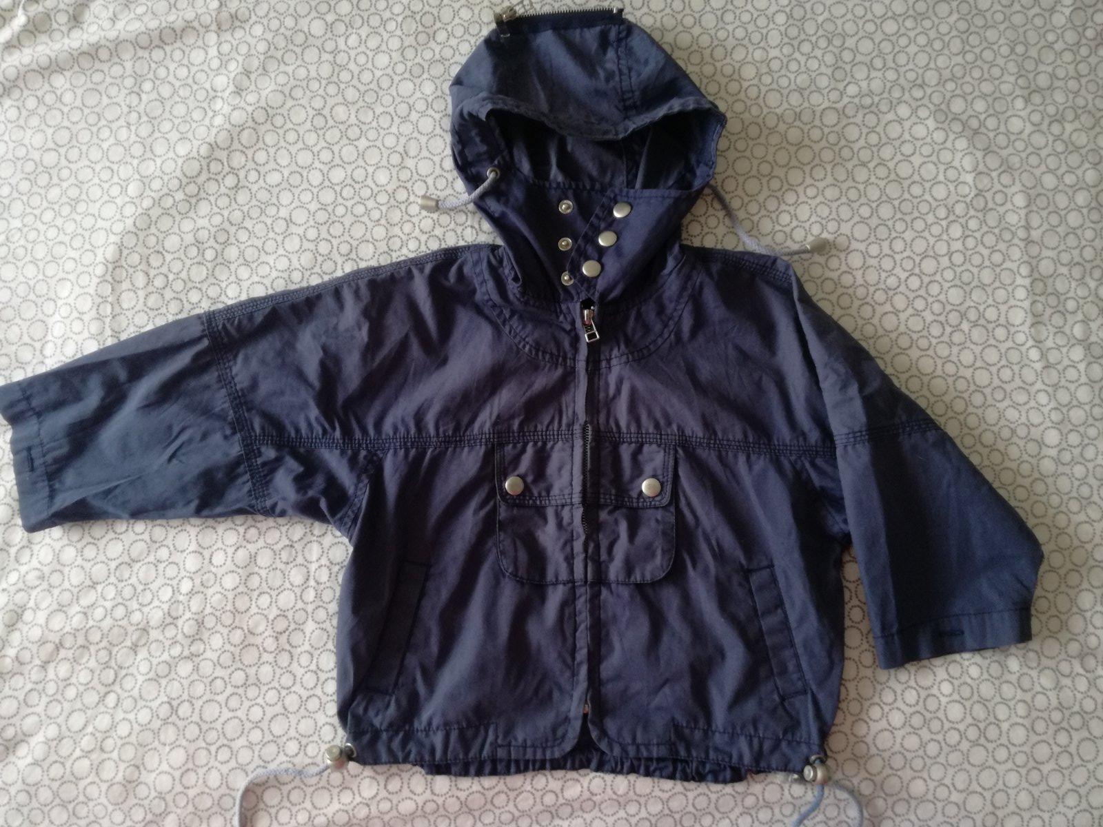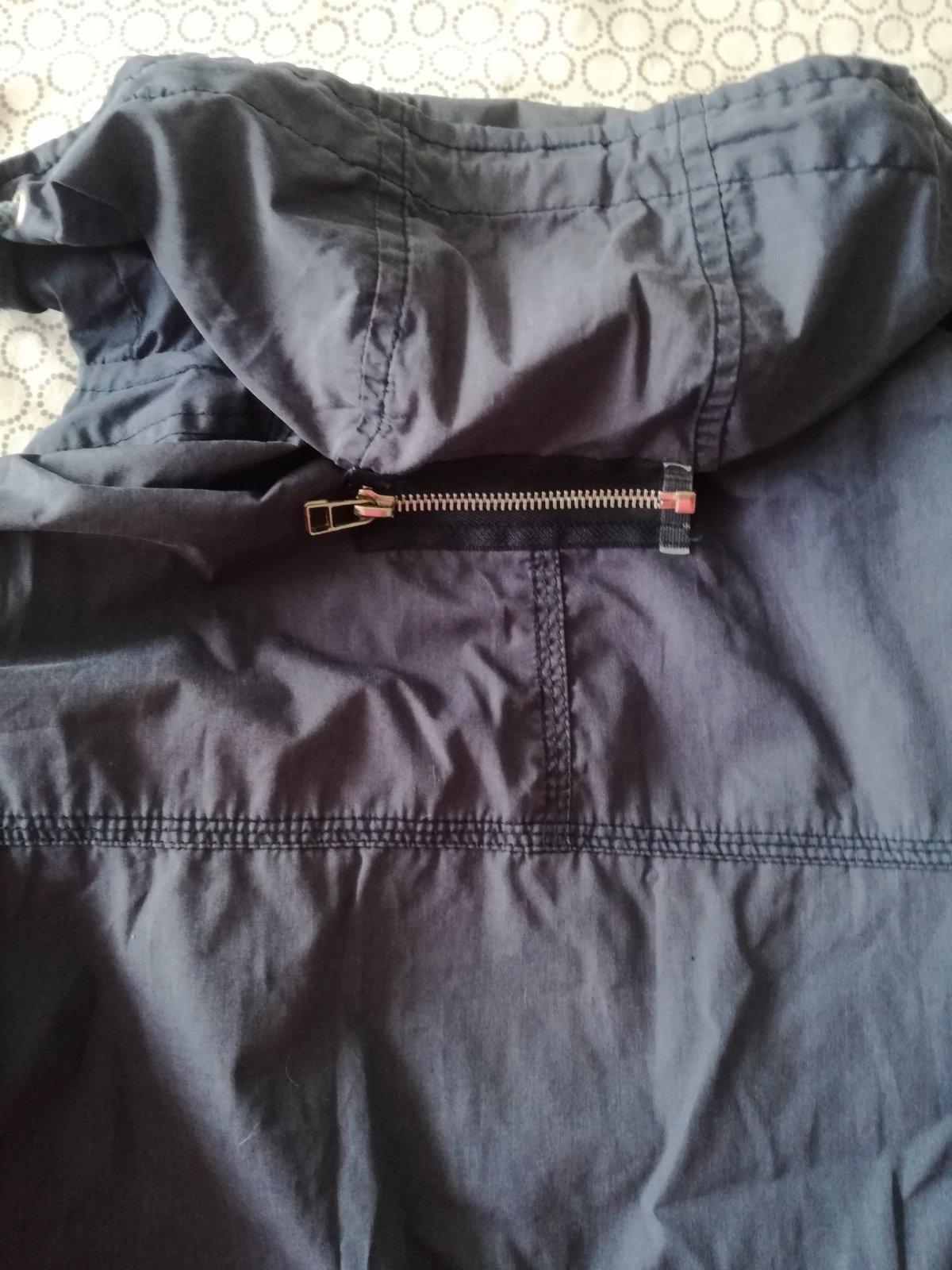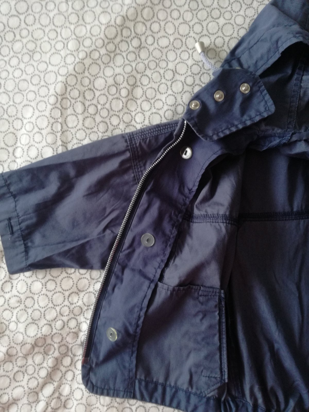Farba krasna modra, ten flak robi mobil. Je bez poskodeni, ale ma 2 male fliaciky pri vacku. Je to tenucky material, ma aj vlozku-vestu ktora sa pripina. Kapucka sa da odzipsovat. Dlzka 40cm, sirka 2x40cm, rukav hore od kapucne 40cm, dole 25cm.