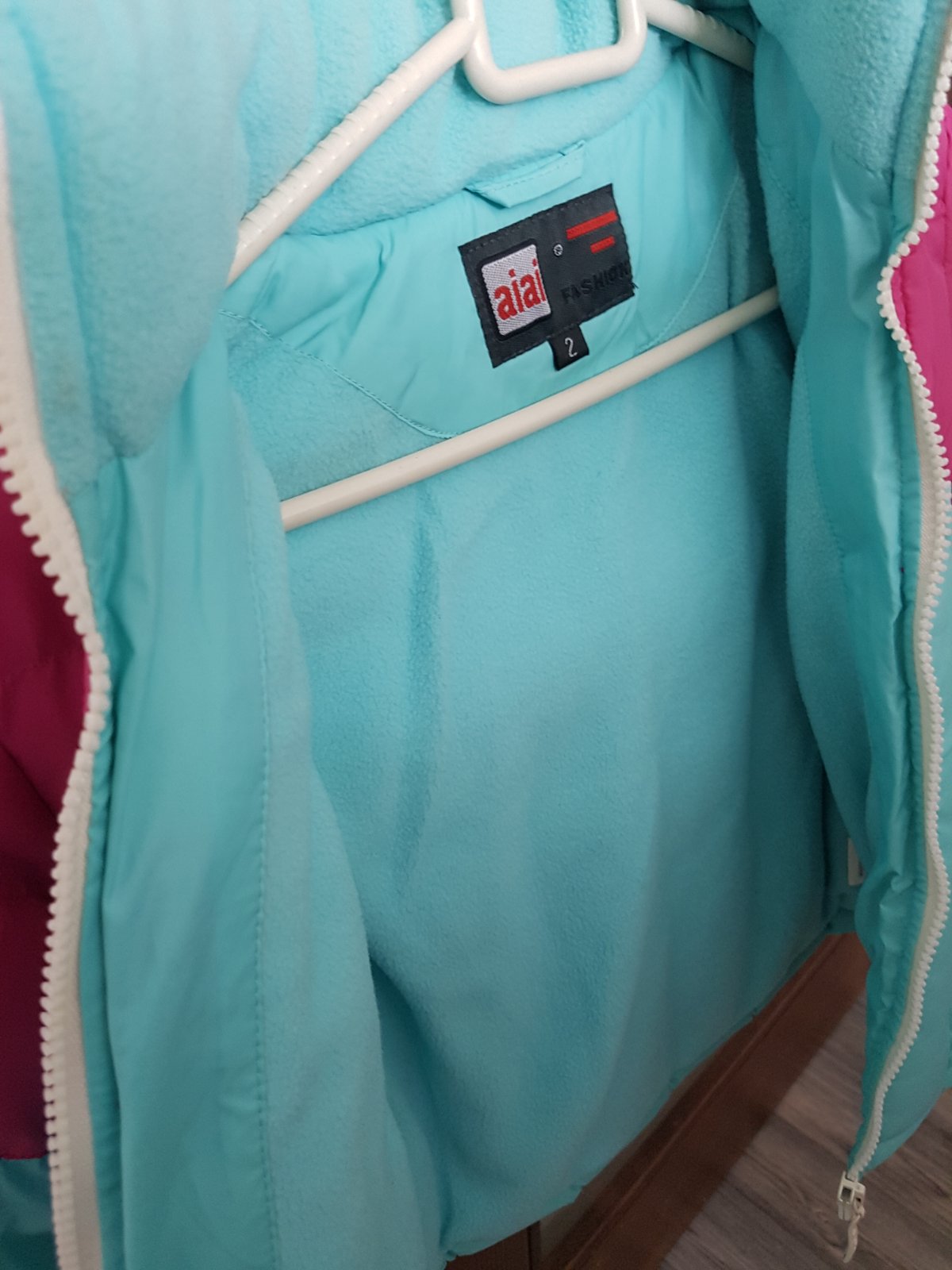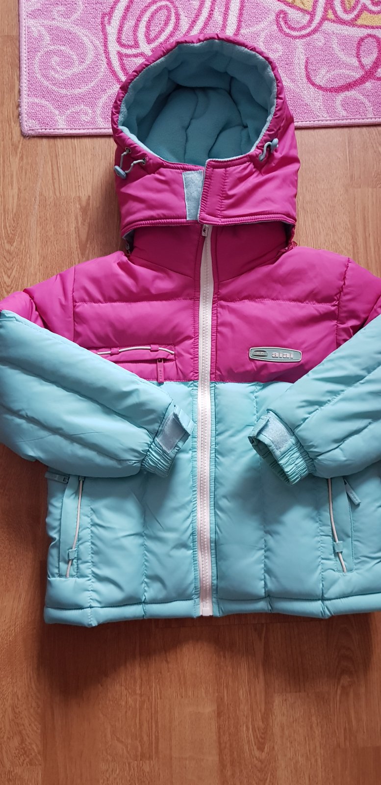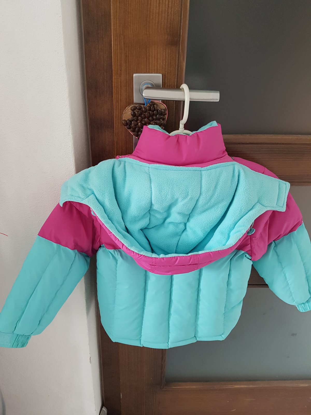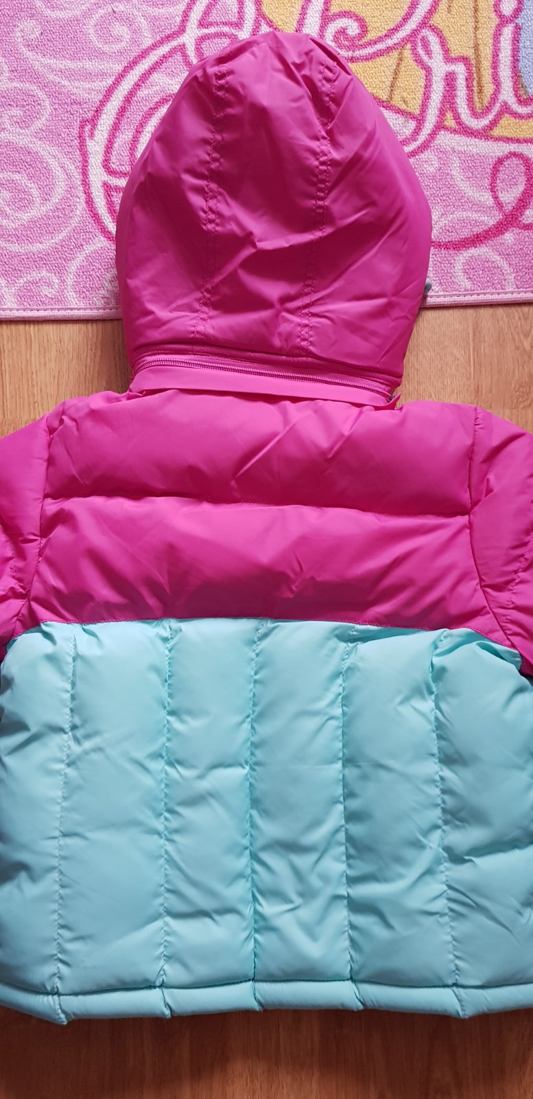 Tepla bunda ruzovo tyrkysova bez poskodeni. Kapucna sa da odzipsovat. Rukavy sa daju korigovat suchym zipsom. Dlzka 42 cm. Sirka pod rukavmi 38 cm.