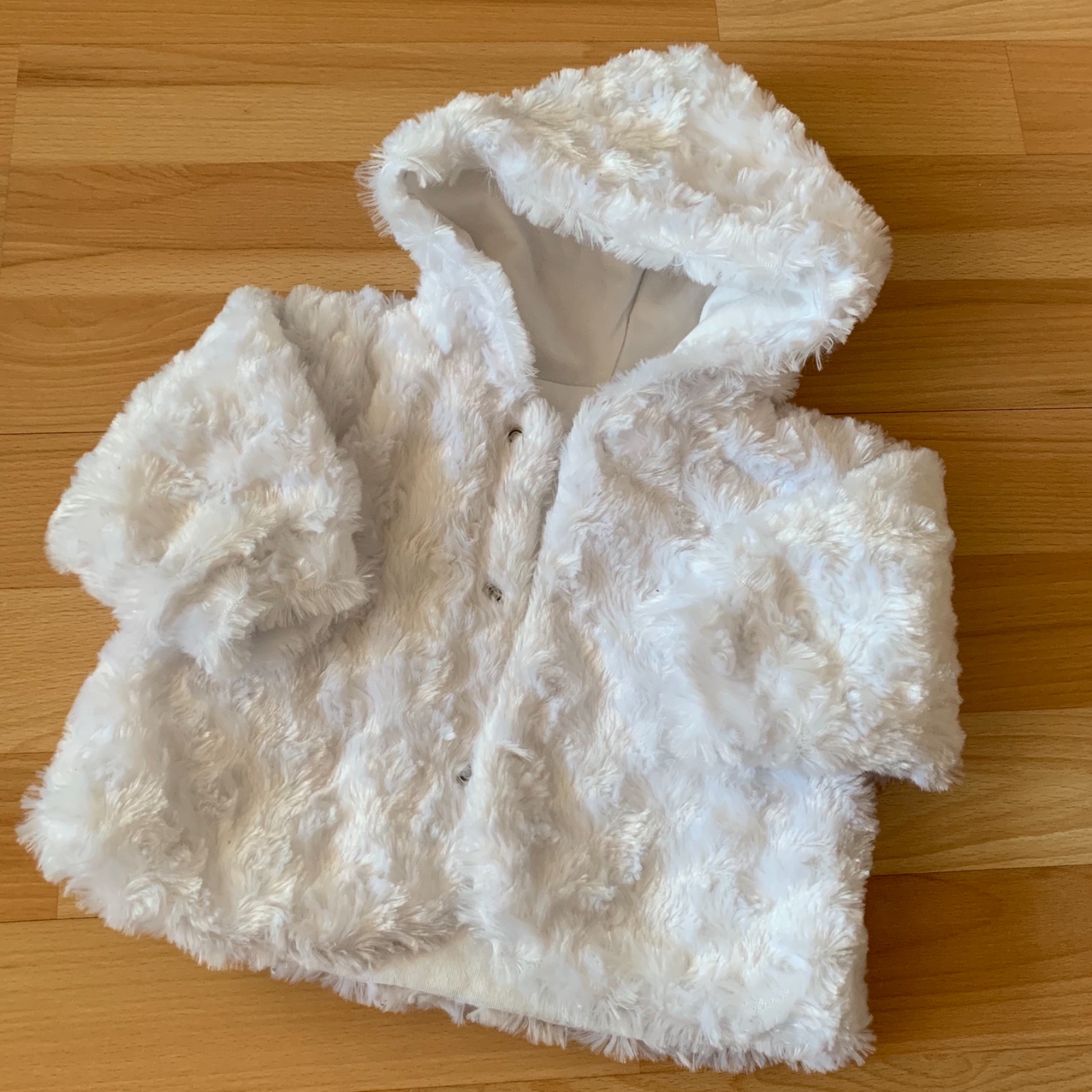Žiarivo biely kožuštek, ako nový, oblečený len na krste. Nieje veľmi teplý, podšitý je len tenkou látkou.