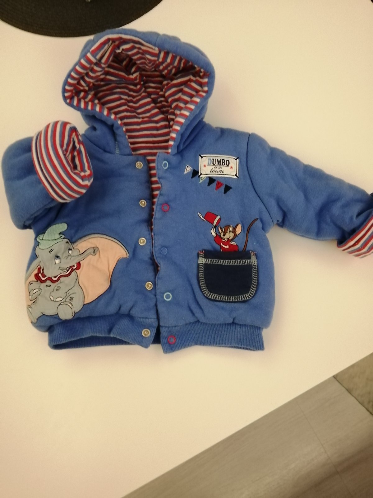 Bundička v krásnom nosenom stave, bez akýchkoľvek poškodení. Vonkajší materiál: 100% bavlna, vnútro: jemný flís. Uvedená veľkosť: 3 -6 mesiacov. Cena: 5 eur + poštovné