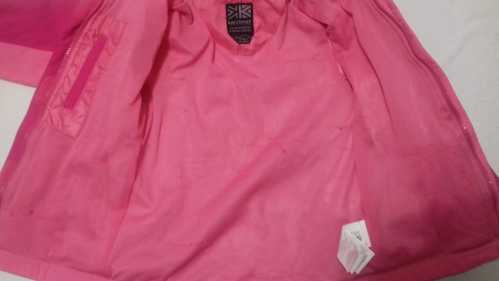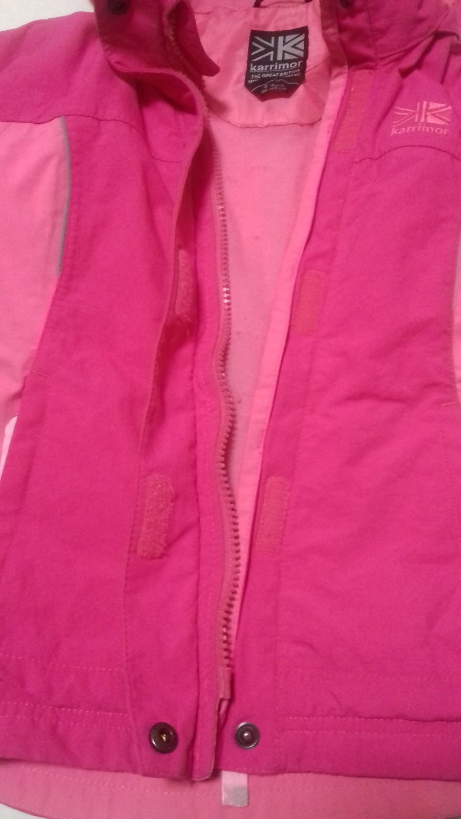 krásna bundička, veľkosť 98-104, ale nosili sme do veľkosti 110, jediná chybička, že sa nám od suchého zipsu zatrhla vnútorná podšívka, ale na funkčnosť a vonkajší vzhľad to nemá žiadny vplyv. kapucka sa dá schovať, skôr na útlejšie dievčatko.