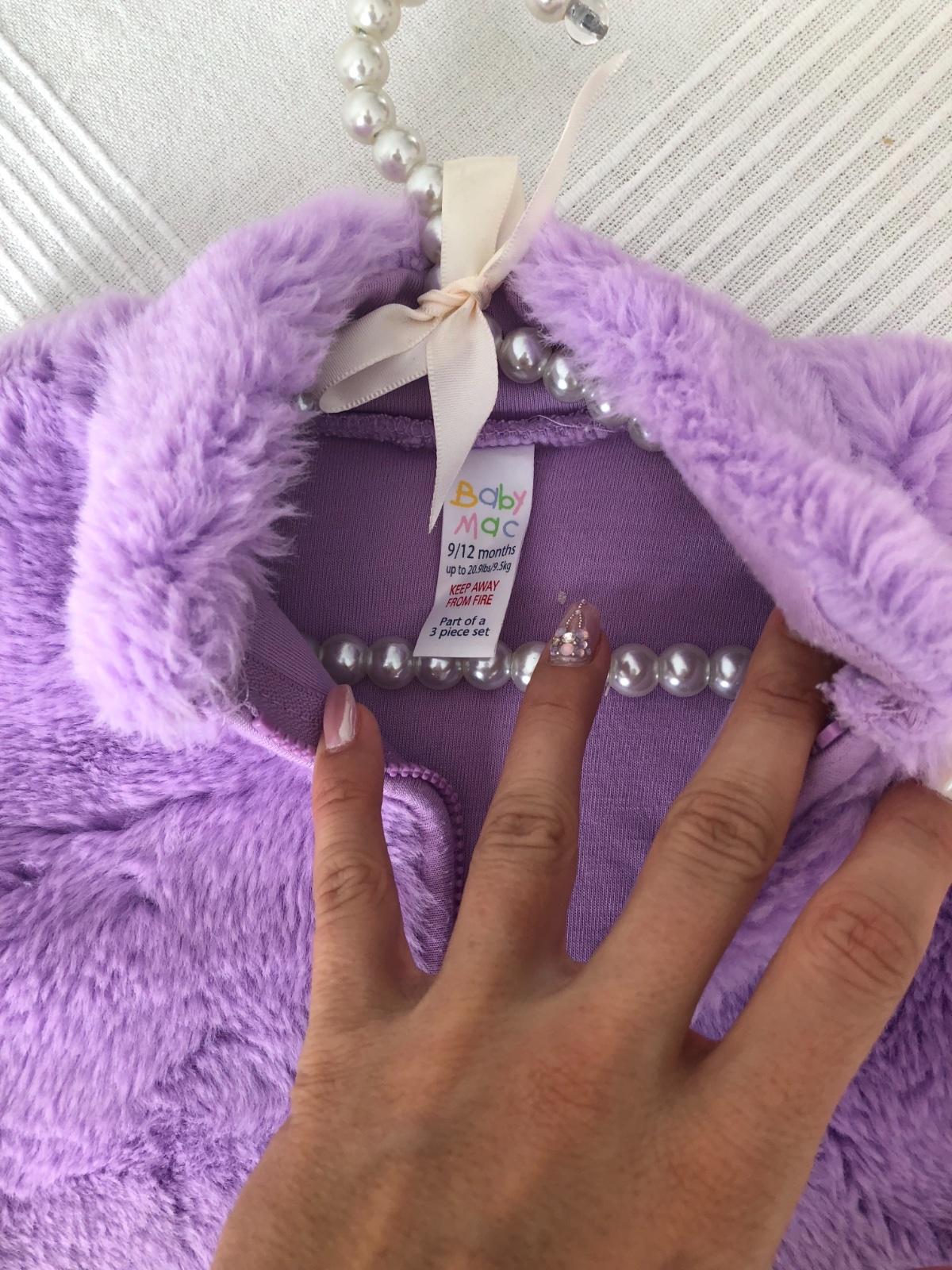 Top stav, nevyuzita. Krasna, jemna kozusinka okolo kapucne, s vreckami. S kozusinovou macickou, krasna ruzova, presivana, jemne trblietkava. Na 1 rok. Dlzka 32 cm, sirka pod pazuchami 26 cm.
