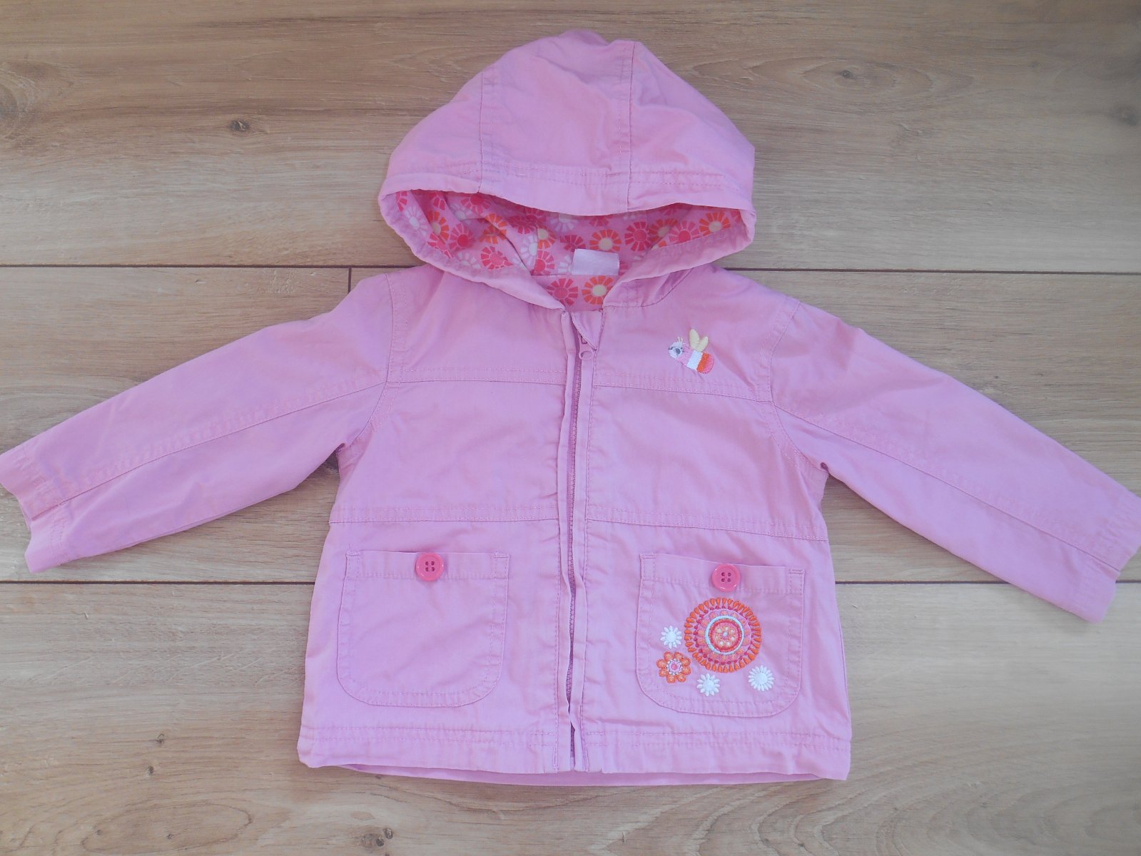 Vetrovka s kapucňou, zapínanie na zips a gombíky, zaujímavo riešená aplikácia na prednej časti vetrovky. Bez poškodení, málo nosená.