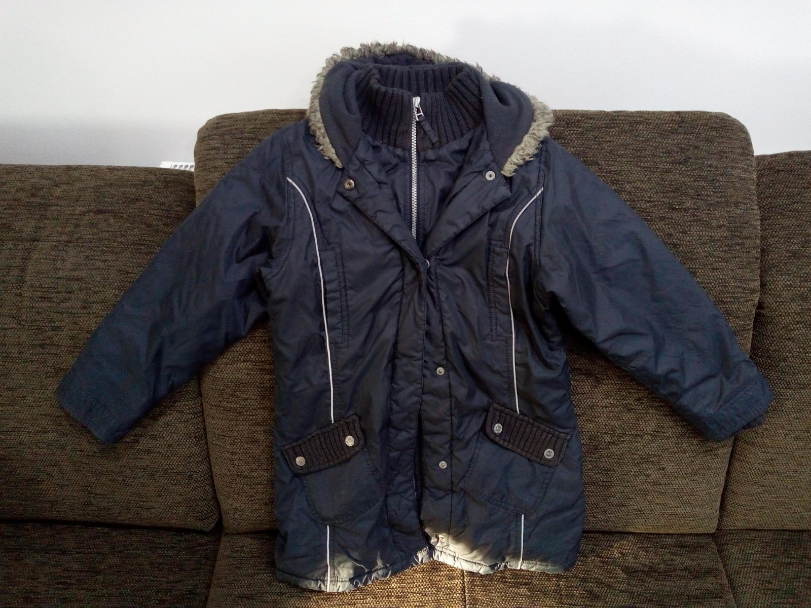 Veľmi obľúbena bunda, noseny stav, farba je taká tmavo modrá, fotka skresľuje. Chybičky nie sú, vidieť nosenie, ale ináč plne funkčná a veľmi pohodlná.