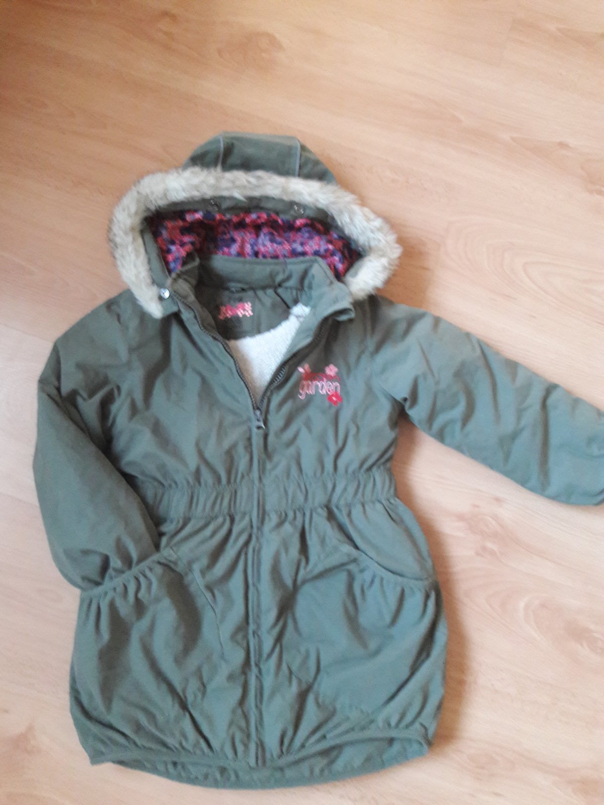 Kapucňa sa dá odopnúť a rovnako aj kožušinka. Bunda má dve hlboké vrecká a v páse je stiahnutá gumičkou.