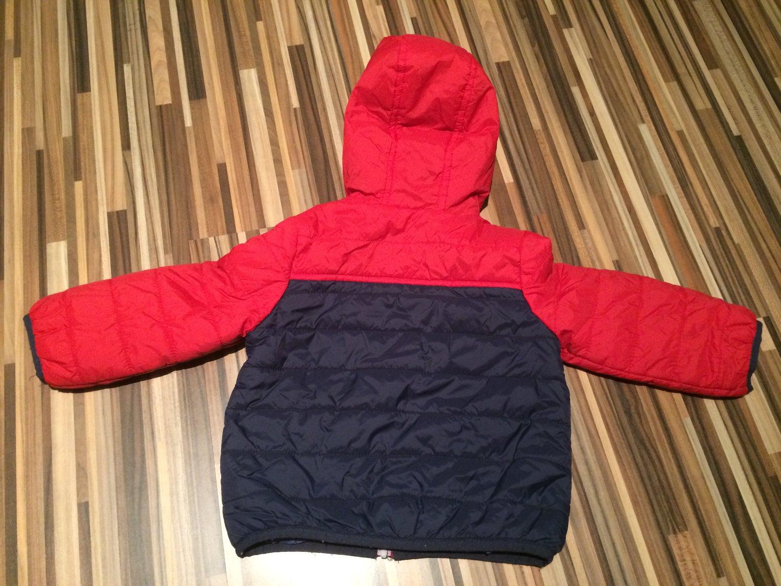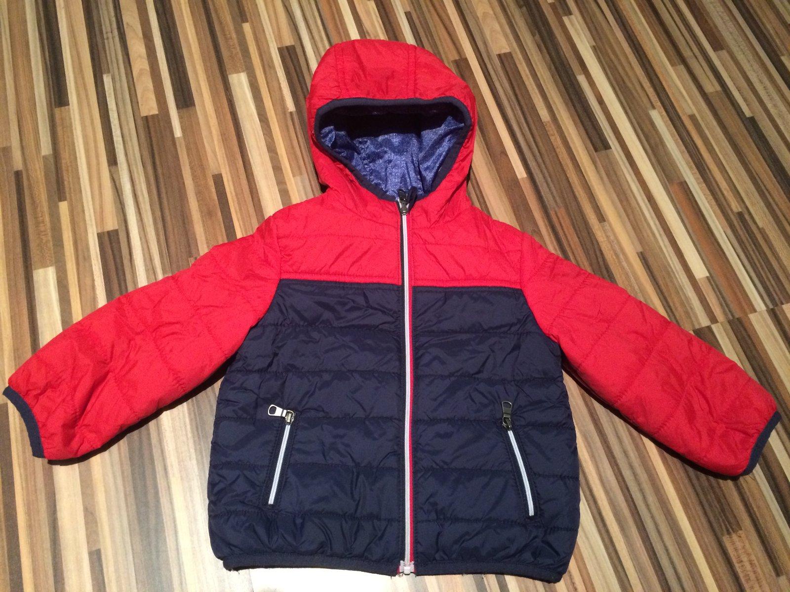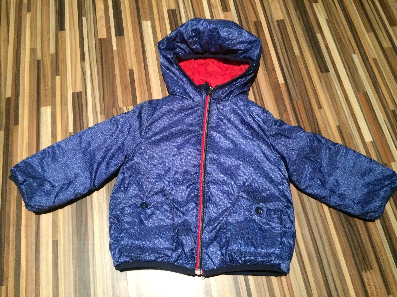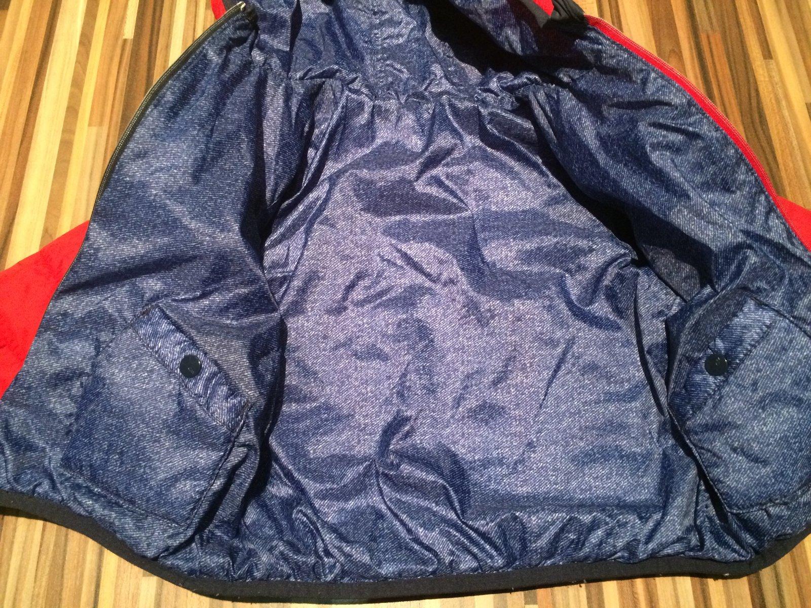 Prechodná obojstranná bunda. Farba "riflovej" časti je podobná tmavým rifliam. Syn ju nosil len červeno-modrou stranou navrch. Bundička je tenšia, príjemná na dotyk a je mäkká.