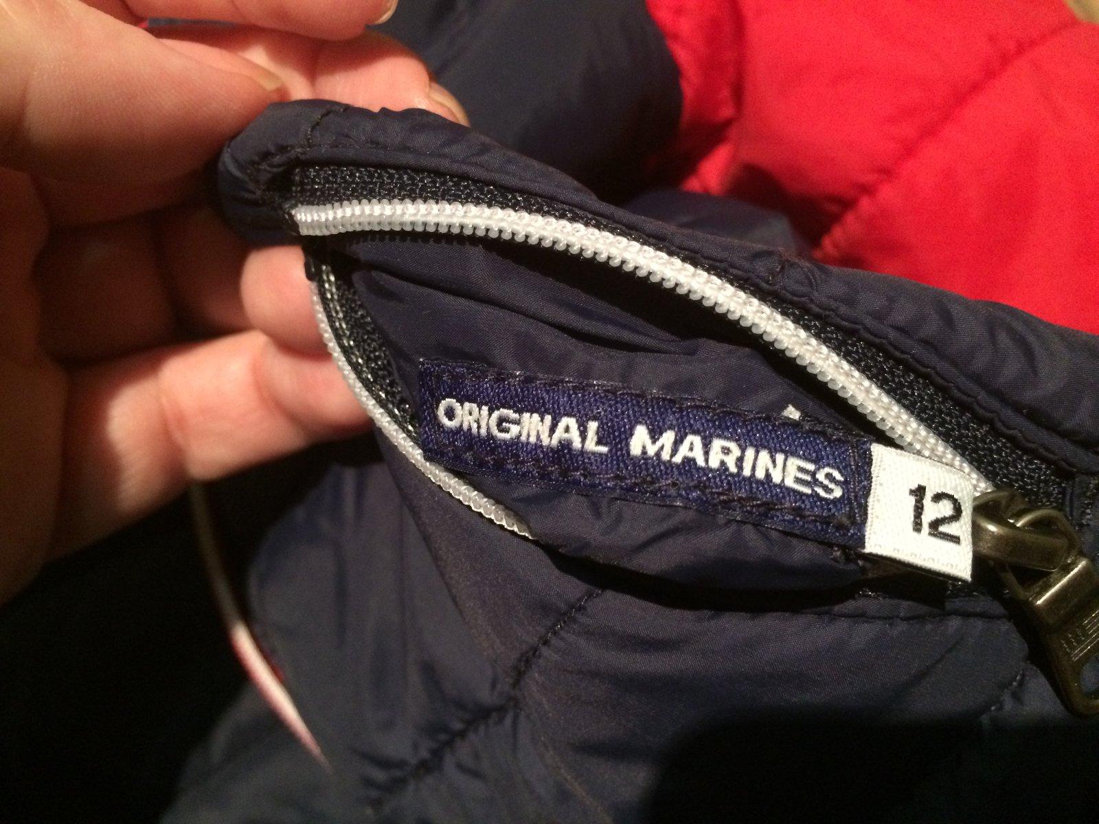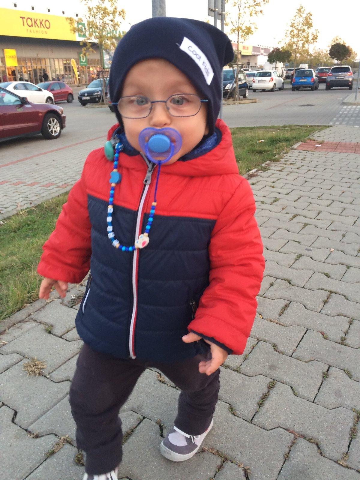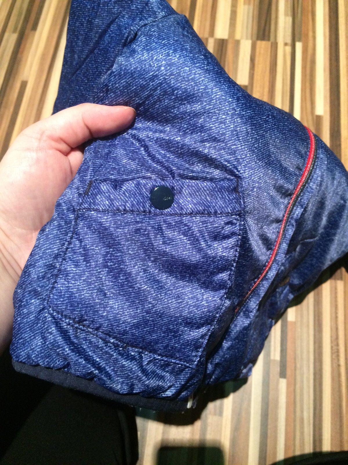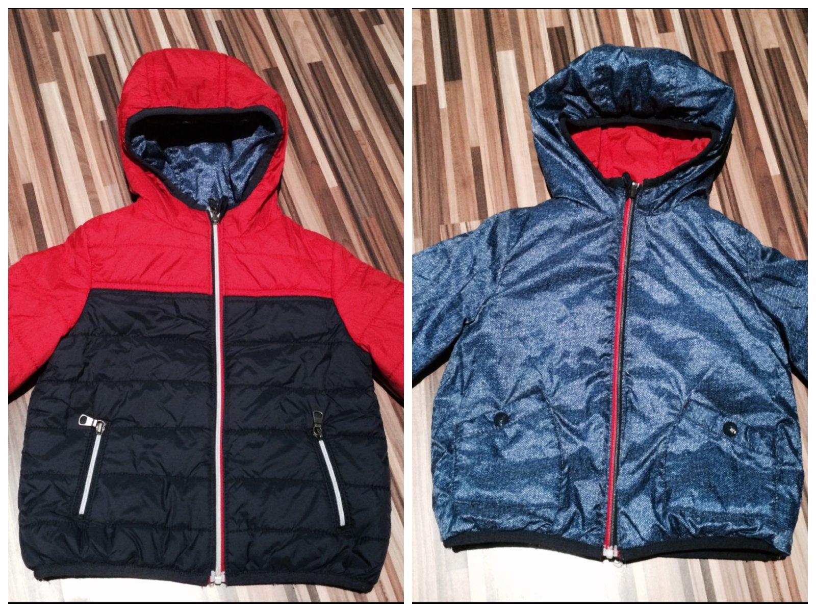 Prechodná obojstranná bunda. Farba "riflovej" časti je podobná tmavým rifliam. Syn ju nosil len červeno-modrou stranou navrch. Bundička je tenšia, príjemná na dotyk a je mäkká.