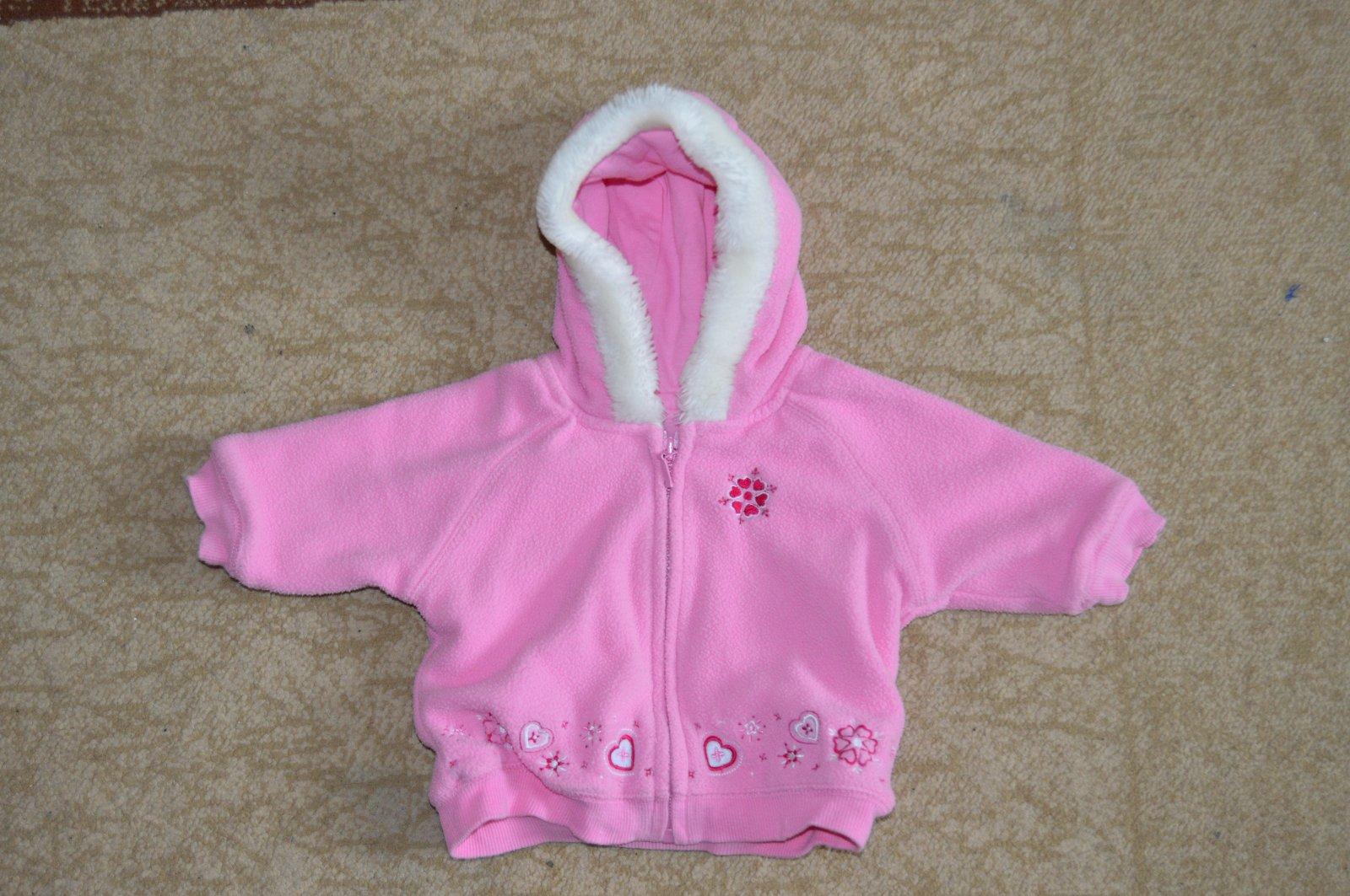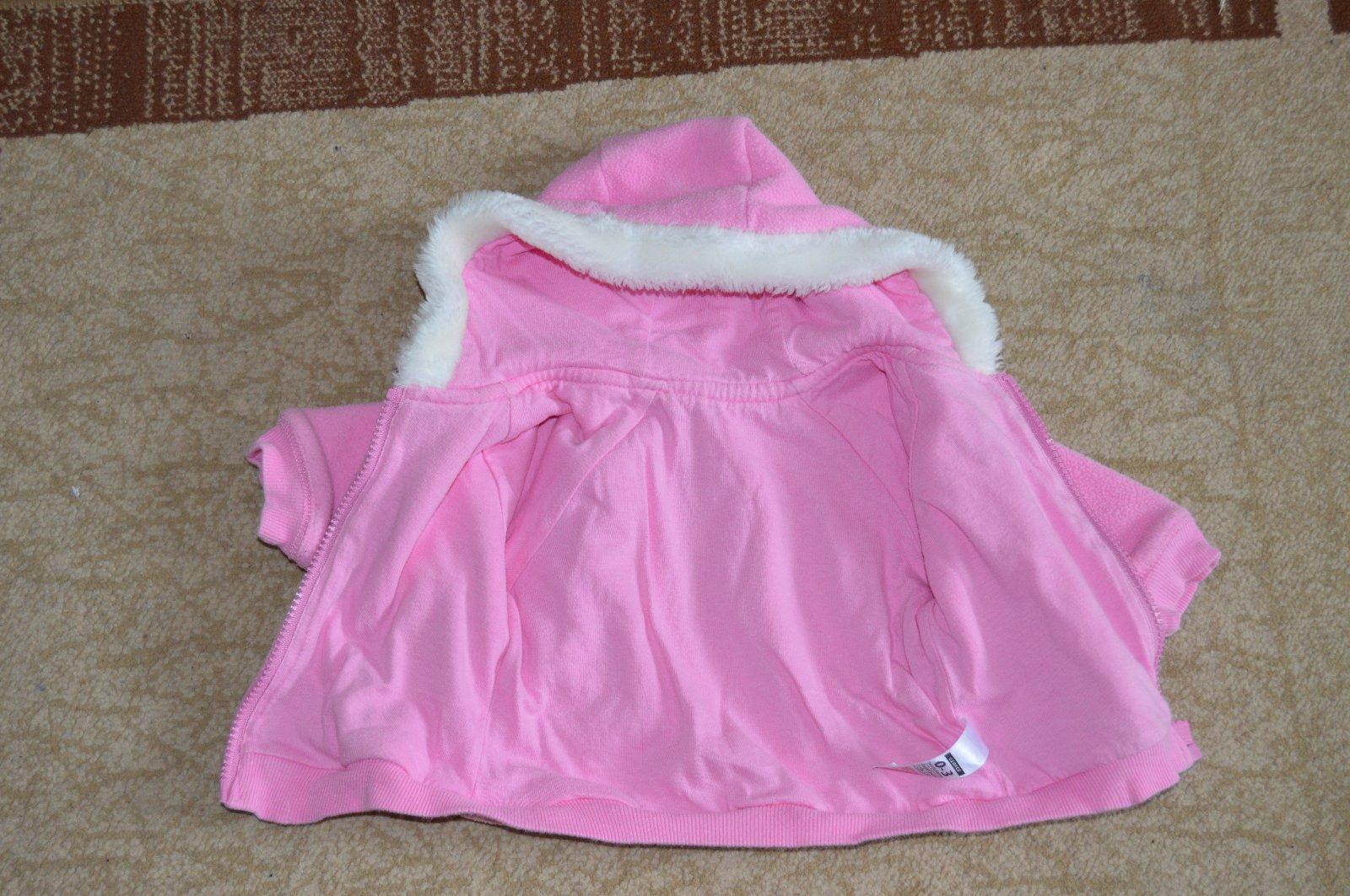 Podšitá ružová bundička.Kapucňa je ozdobená umelou kožušinou.Má známky nosenia - žmolky-ako všetky flísové veci,ale je bez poškodení - bez dier.