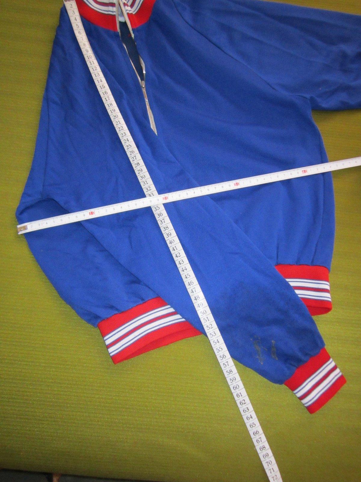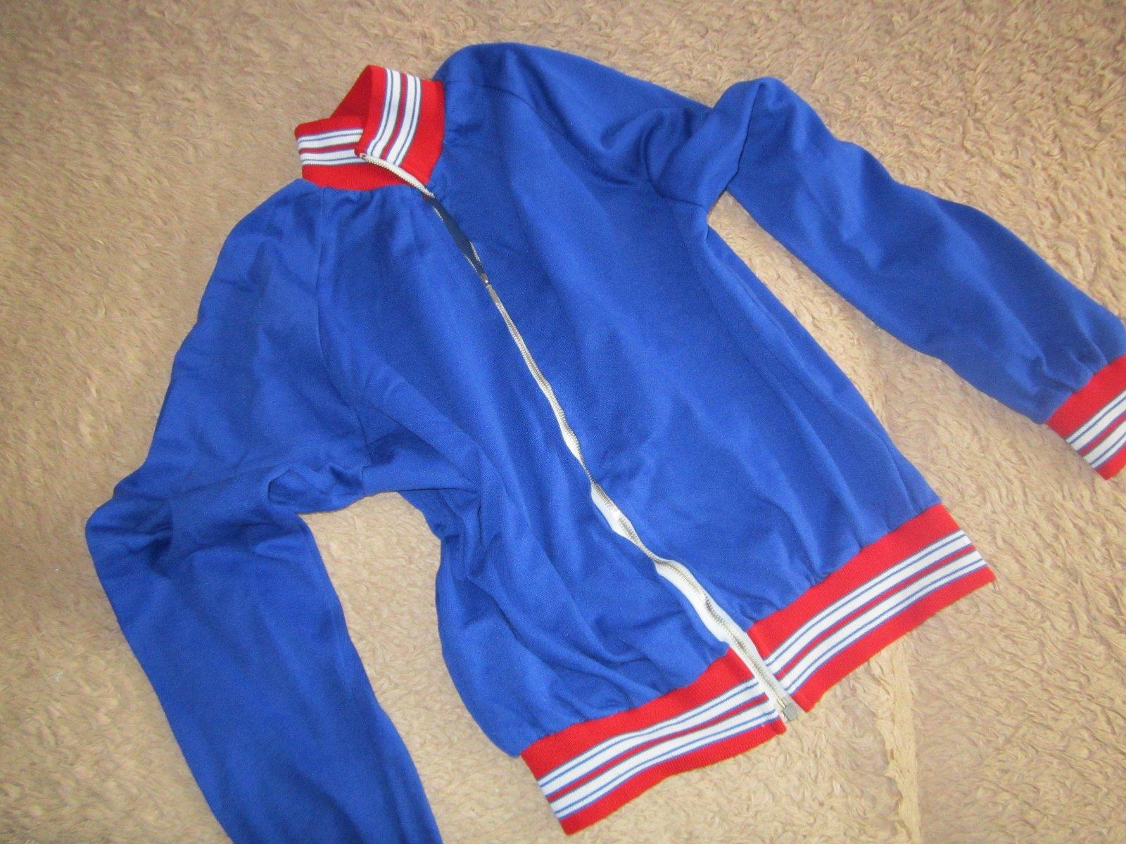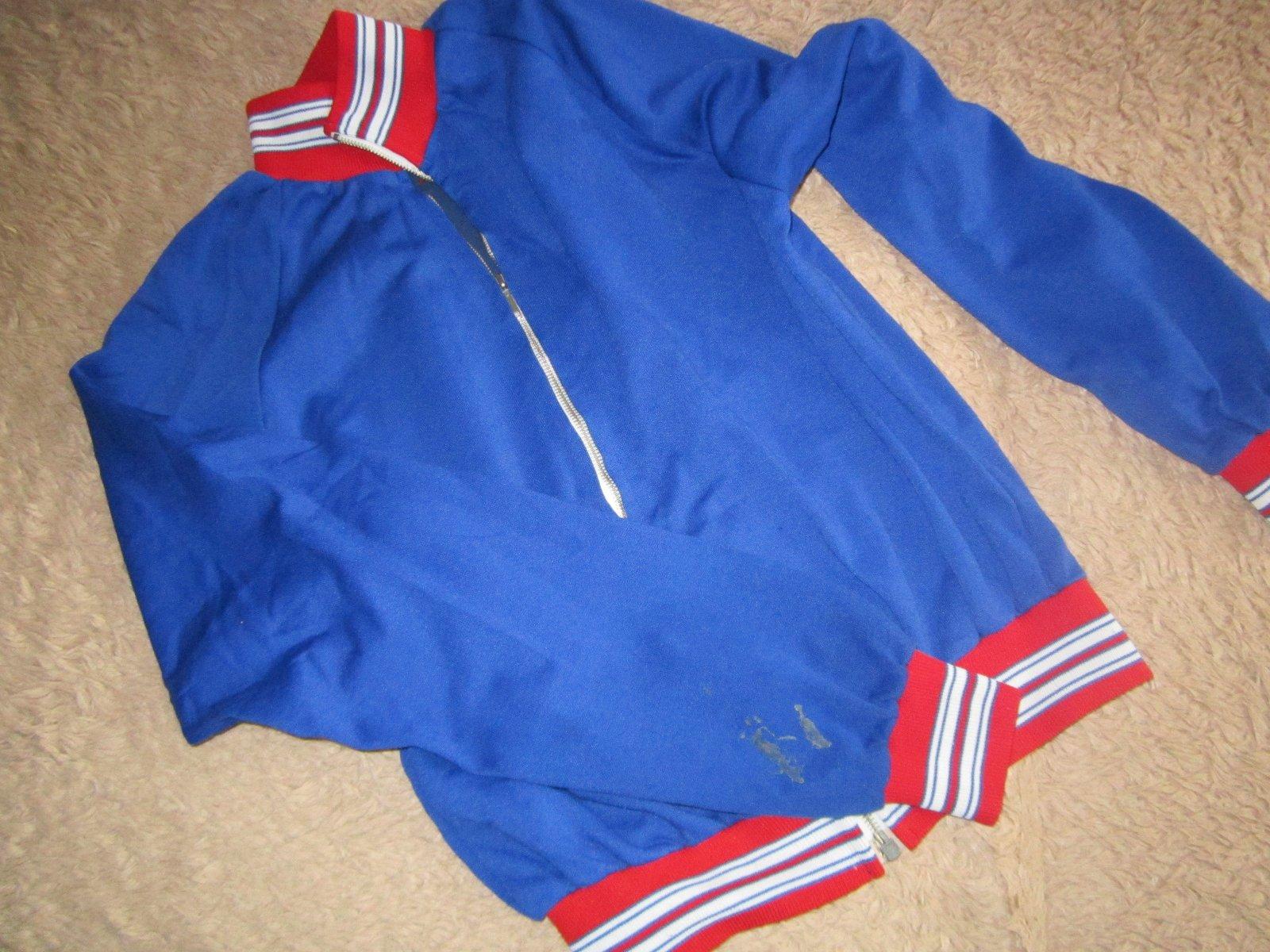 Modrý vrch s červeným kombin., raglánové ruk. so zipsom vpredu. Na pravom ruk. je fľak, pravdepodobne od lepidla. Málo nosený, zachovalý.