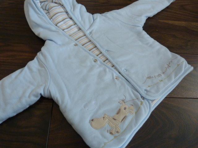 Prechodná, teplejšia, obojstranná, veľ. 74, zn. Marks & Spencer. Pásikavú časť bundičky sme nemali ani raz oblečenú. Modrá časť málo nosená, sú na nej jemné minižmolečky po praní. Cena + posta