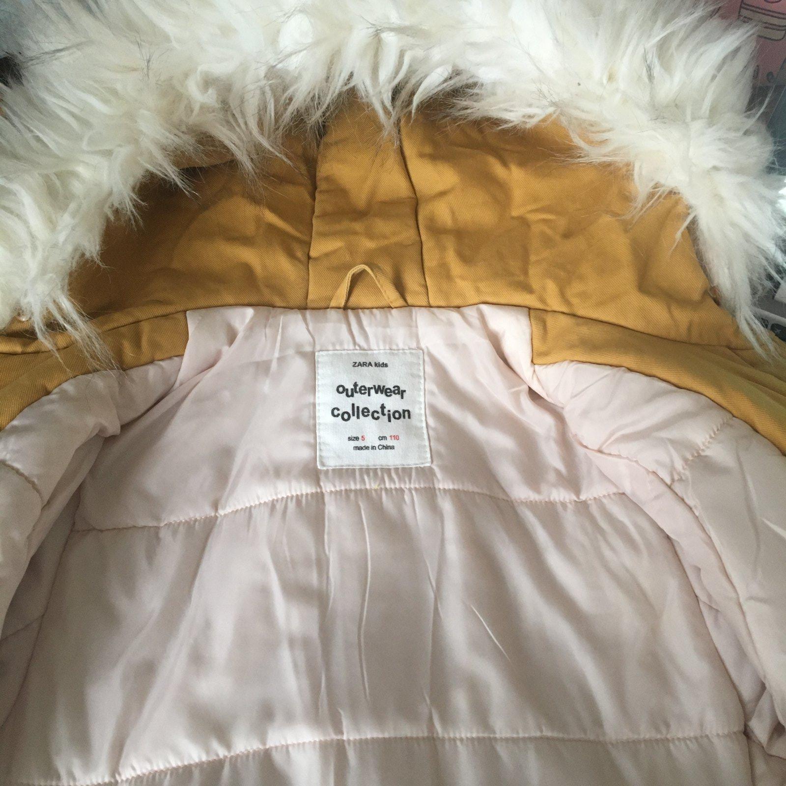 Dievčenský predĺžený kabát/bundička. Áčkový strih, na kapucni bohatá kožušina, ktorá sa dá odopnúť, zapínanie na zips. Vpredu 4 vrecká a dekoratívne šnúrky.