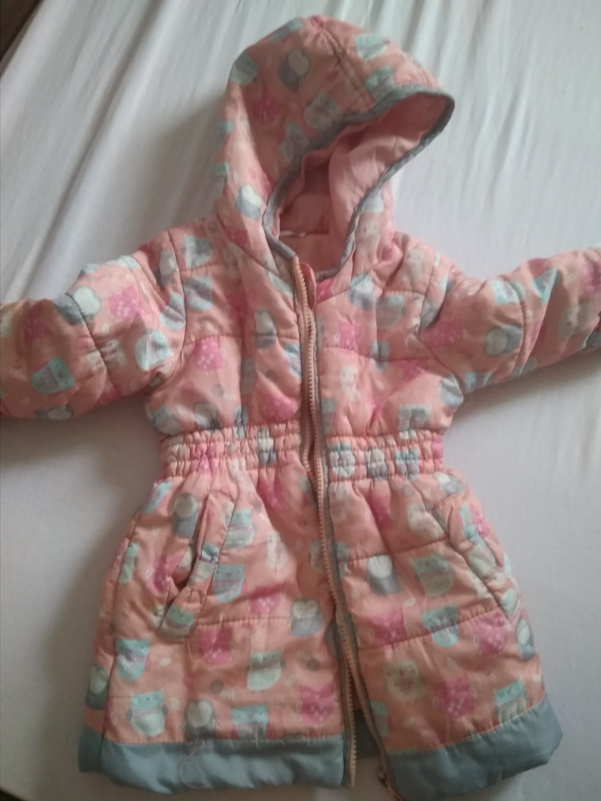 Zimná bundička. Zapínanie má trošku atypické,trošku do strany,viď foto. Na prednej strane 2mini fliačiky,inak bez poškodení.