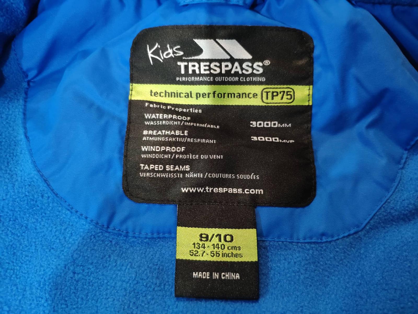 Chlapčenská hight-tech bunda z kolekcie outdoorovej značky Trespass, waterproof-odolné vode i snehu, breathable-paropriepustné, windproof-odolné vetru, coldheat-ľahké ale hrejivé materiály. Zapínanie na zips a suchý zips, vybavené niekoľkými vreckami, odopínateľná kapucňa.