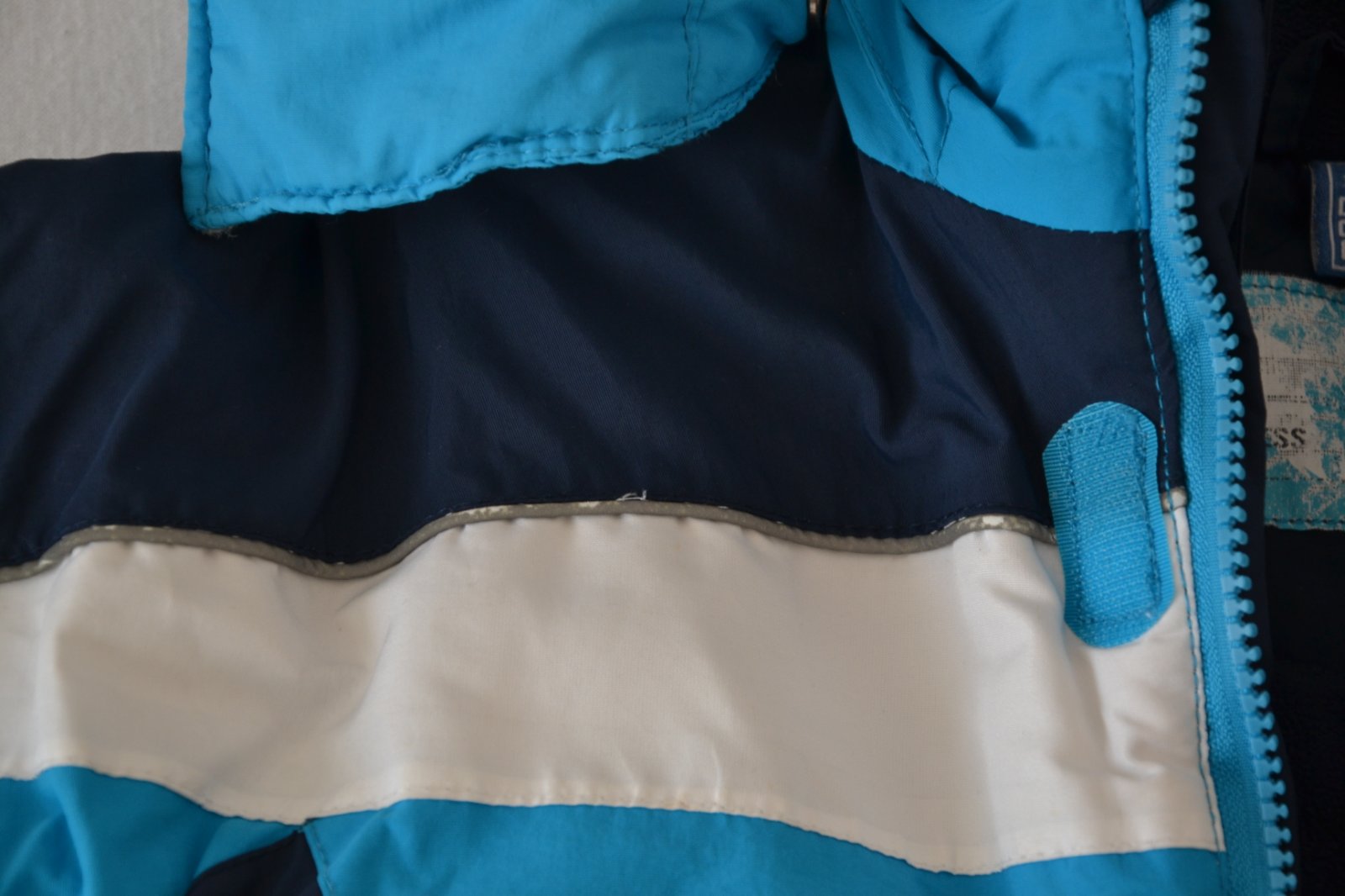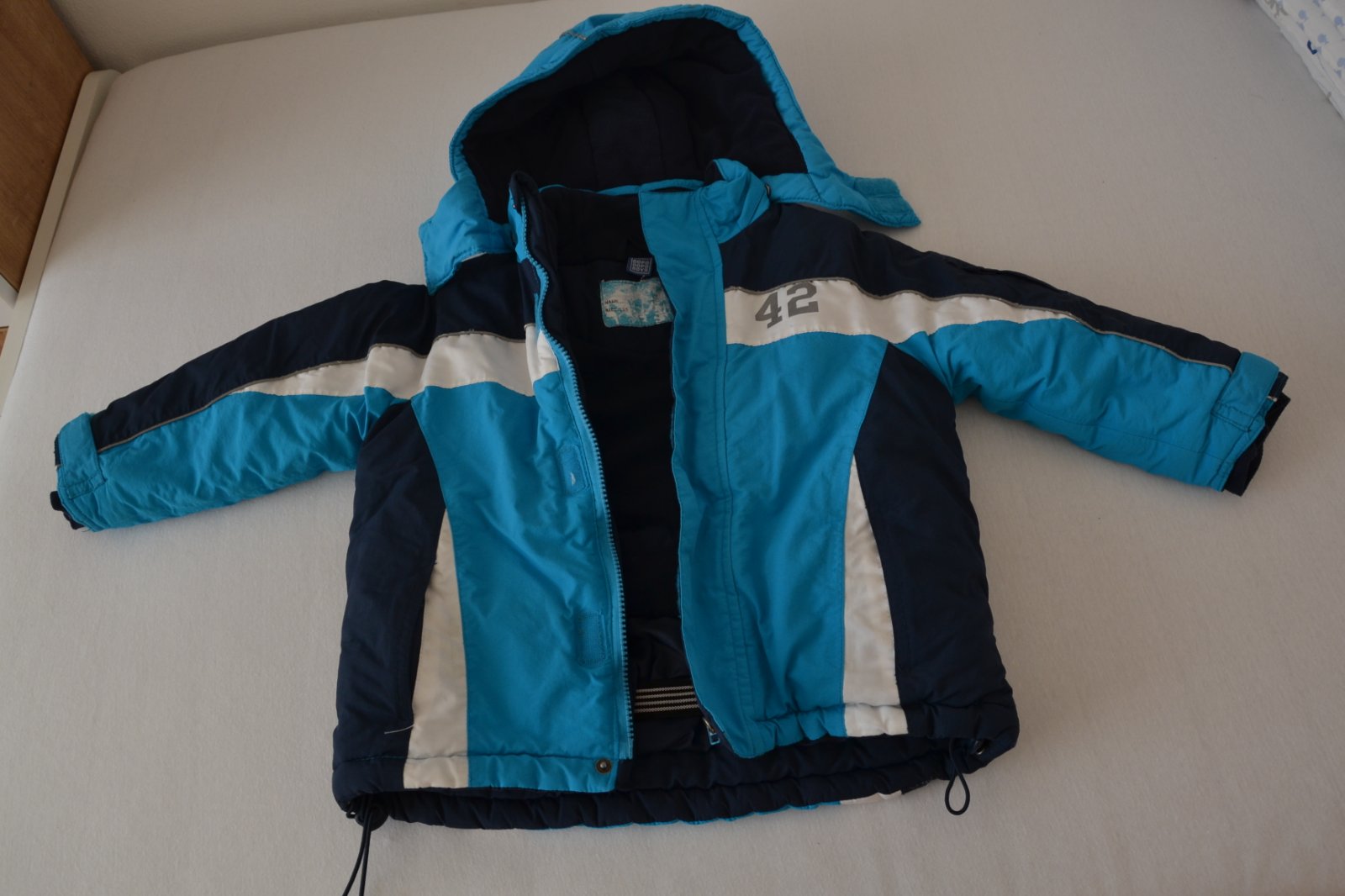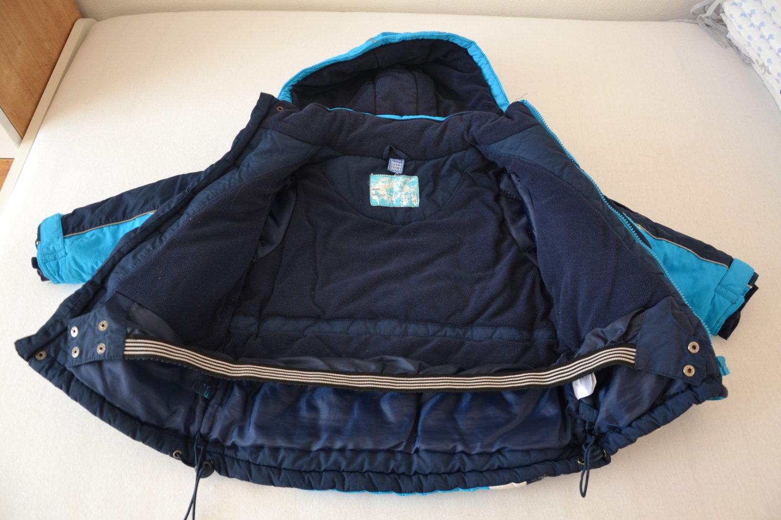 Zachovalá nosená bunda, žmolky z vnútornej strany, ošúchané reflexné pásiky na niektorých miestach - vid. fotky. Pás proti vetru a snehu, odopínateľná kapucňa na cvoky. Super na tuhú zimu.