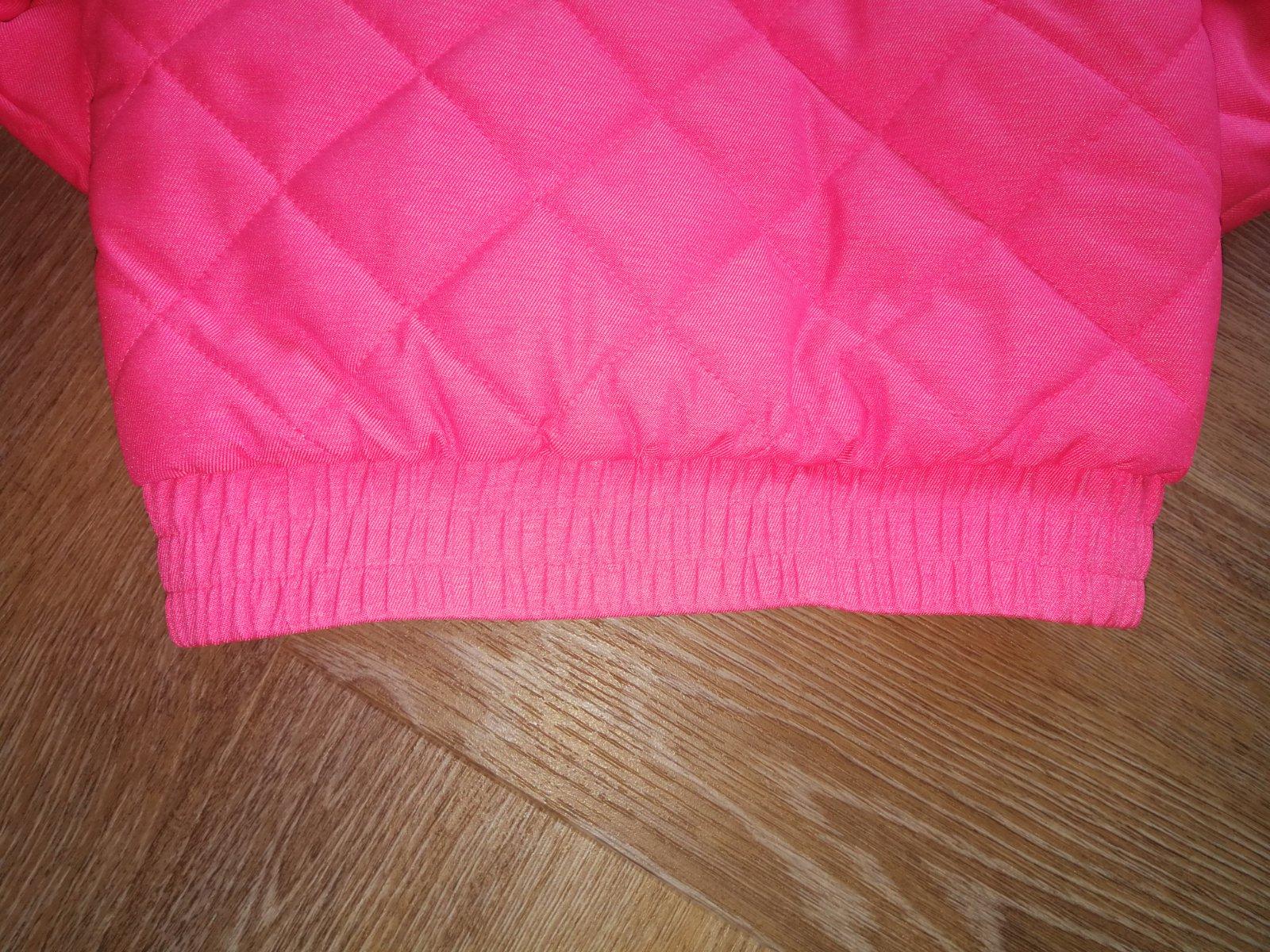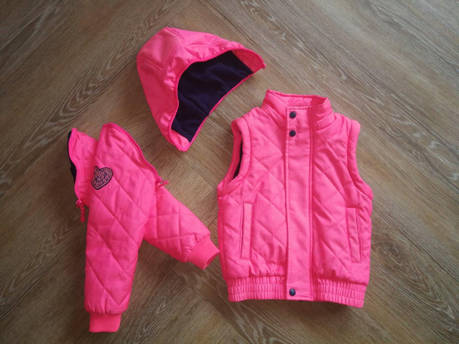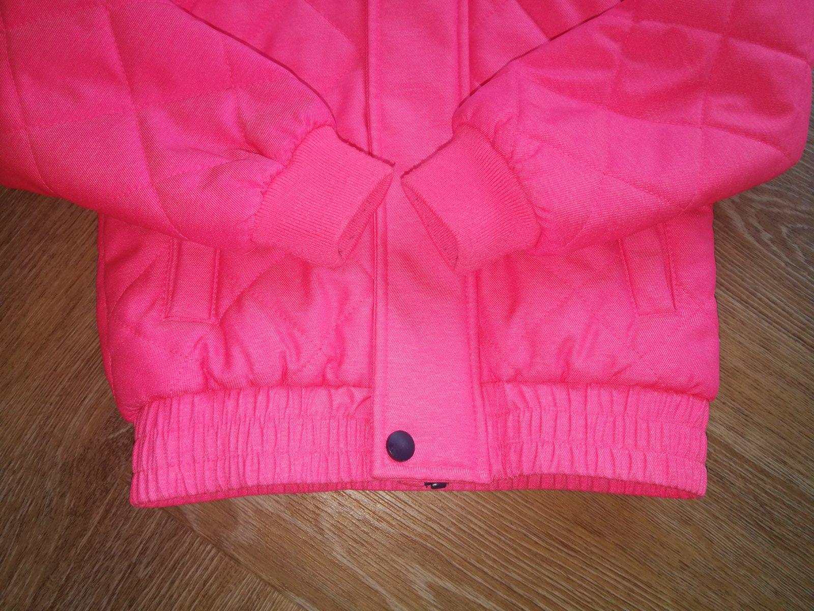 Nosená, no stále je vo veľmi dobrom stave. Vyteplená dekovinou, 2 vrecká, dolný okraj stiahnutý hrubým pásom gumy, proti snehu. Zapínanie na zips+ vrchná lišta na cvoky. Na rukáve krásna aplikácia v tváre srdiečka. Vo vnútri náprsne vrecko. Kapucňa ako aj rukávy odnímateľné= bunda sa dá prerobiť na teplú vestu, čo je veľká výhoda. Dve veci v jednej. Bunda je sýto ružová, dcérka ju nosila aj na lyžovačku. Na kopci bola veľmi dobre viditeľná a mali sme ju stále v dohľade.
