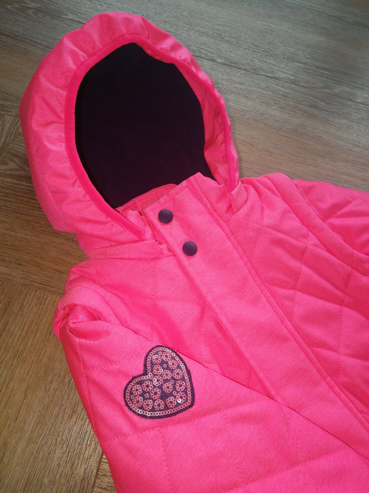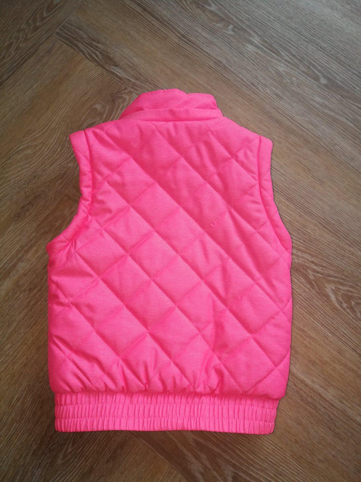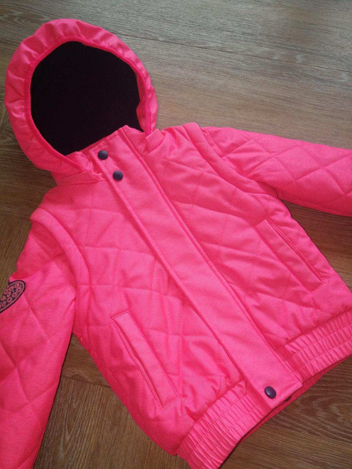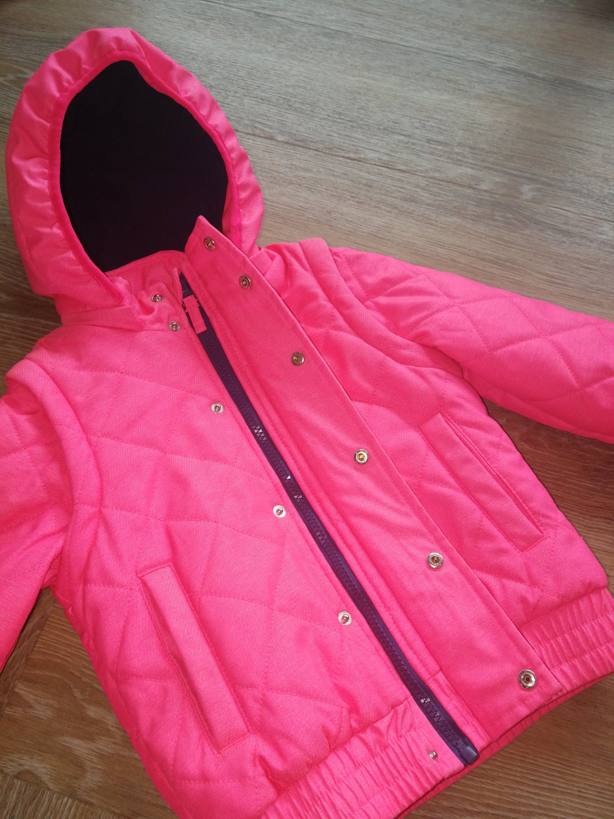 Nosená, no stále je vo veľmi dobrom stave. Vyteplená dekovinou, 2 vrecká, dolný okraj stiahnutý hrubým pásom gumy, proti snehu. Zapínanie na zips+ vrchná lišta na cvoky. Na rukáve krásna aplikácia v tváre srdiečka. Vo vnútri náprsne vrecko. Kapucňa ako aj rukávy odnímateľné= bunda sa dá prerobiť na teplú vestu, čo je veľká výhoda. Dve veci v jednej. Bunda je sýto ružová, dcérka ju nosila aj na lyžovačku. Na kopci bola veľmi dobre viditeľná a mali sme ju stále v dohľade.