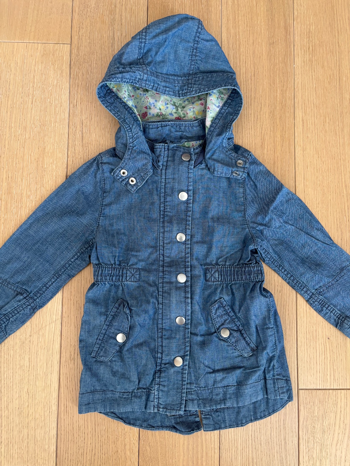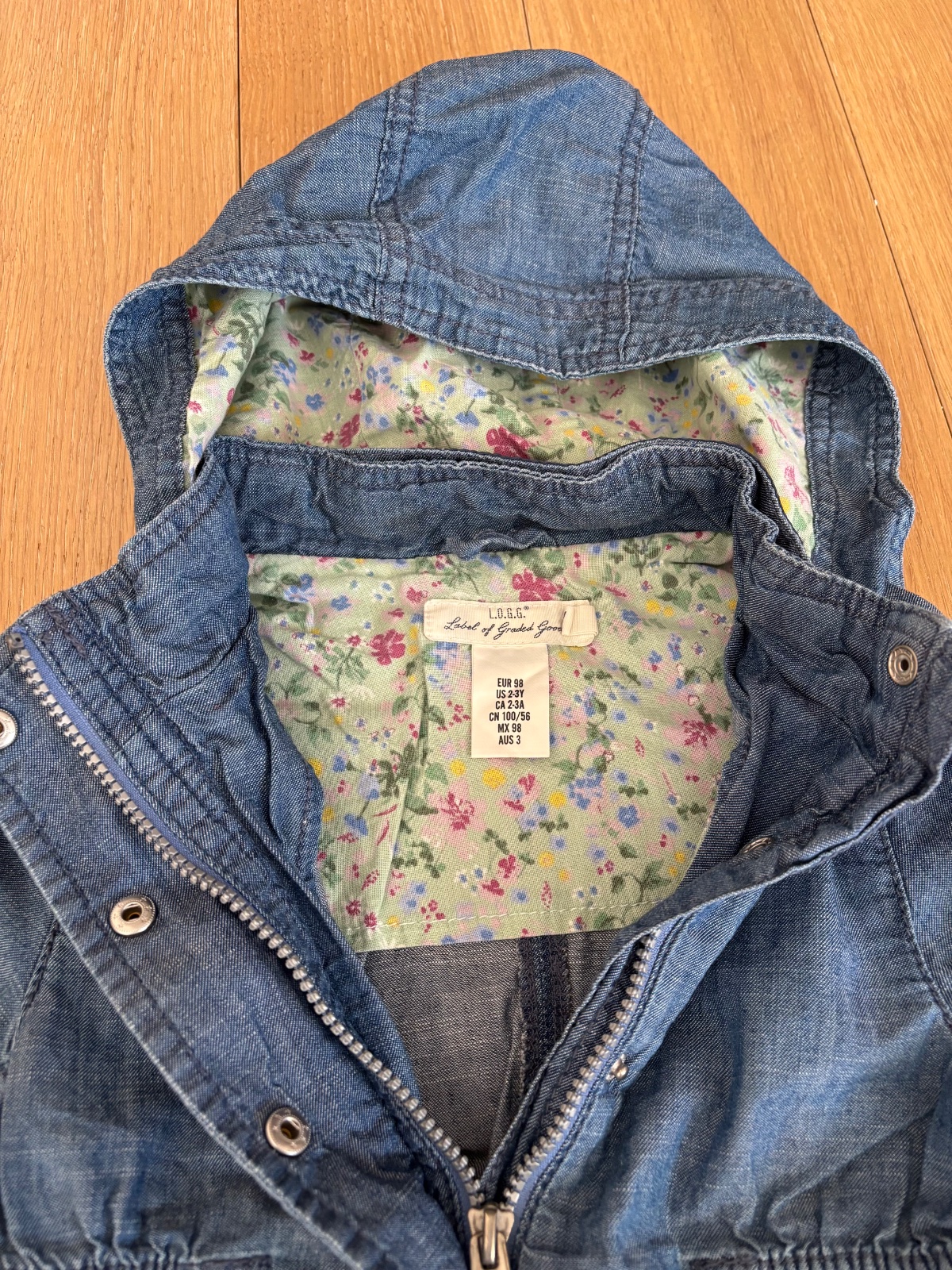 Veľmi pekná riflová bunda, na štítku je veľkosť 104, ale je nositeľná od 98, takže som zaradila k menšej veľkosti, miery na foto.