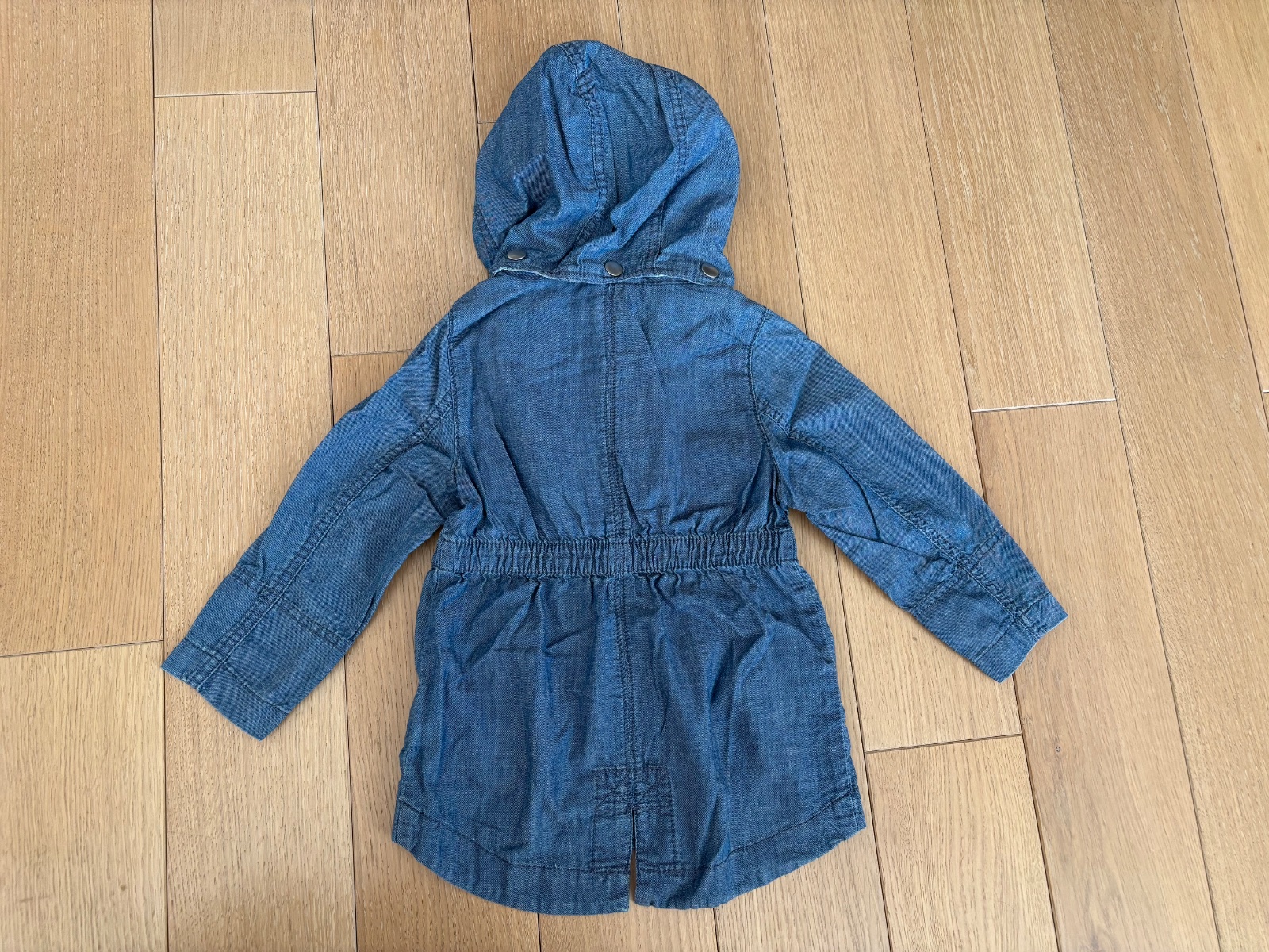 Bunda do dazda s odnimatelnou kapucnou, 98/104. Poskodenie ziadne, akurat gombiky spredu zosuchane asi pranim. Sirka 37, rukav po plece 40, dlzka 47 cm
