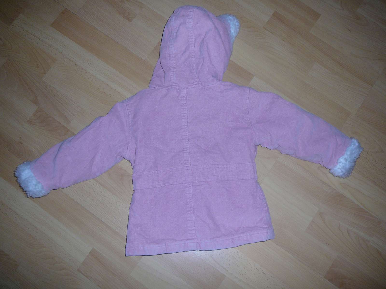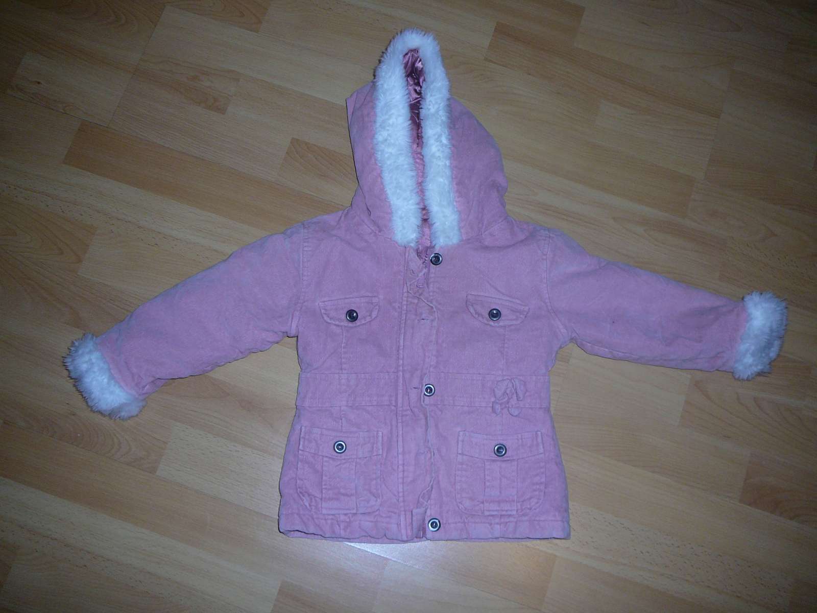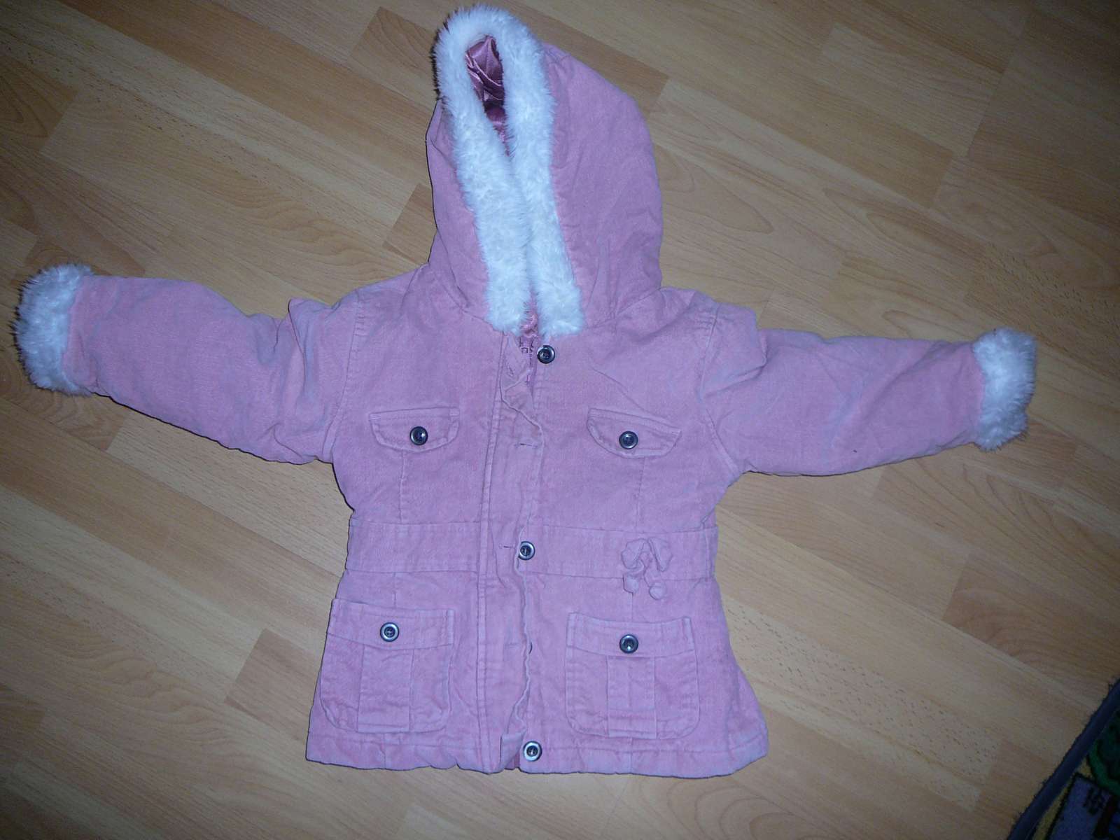 ružovej farby,bez vaznejsích poskodení(súchana farby na gombíkoch),s kapucnou
