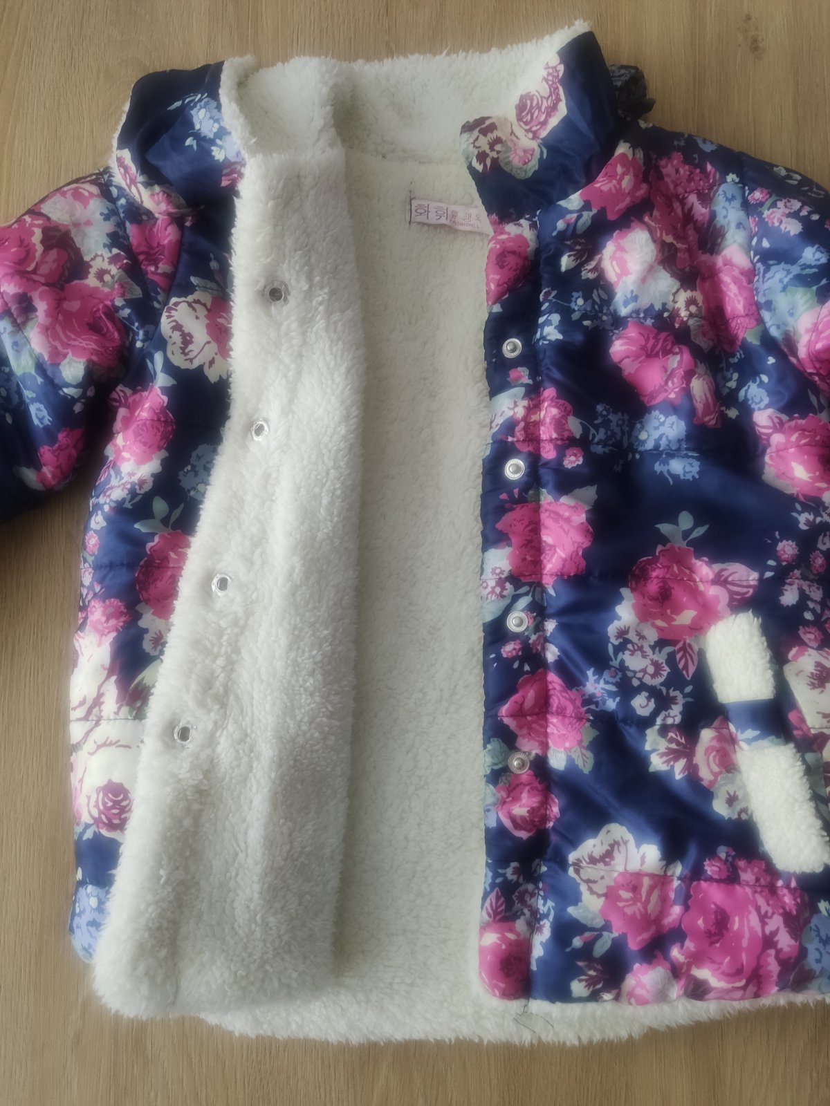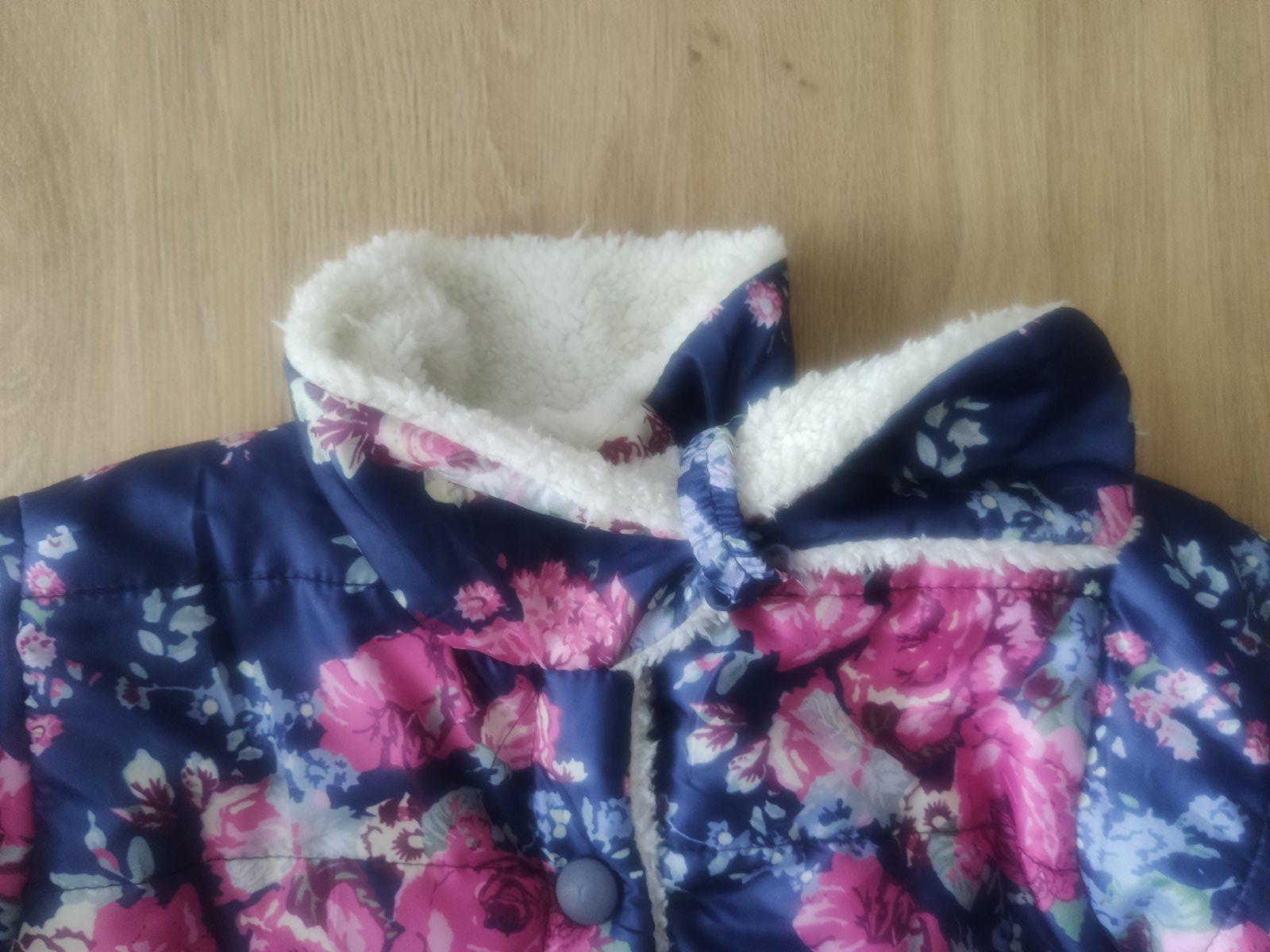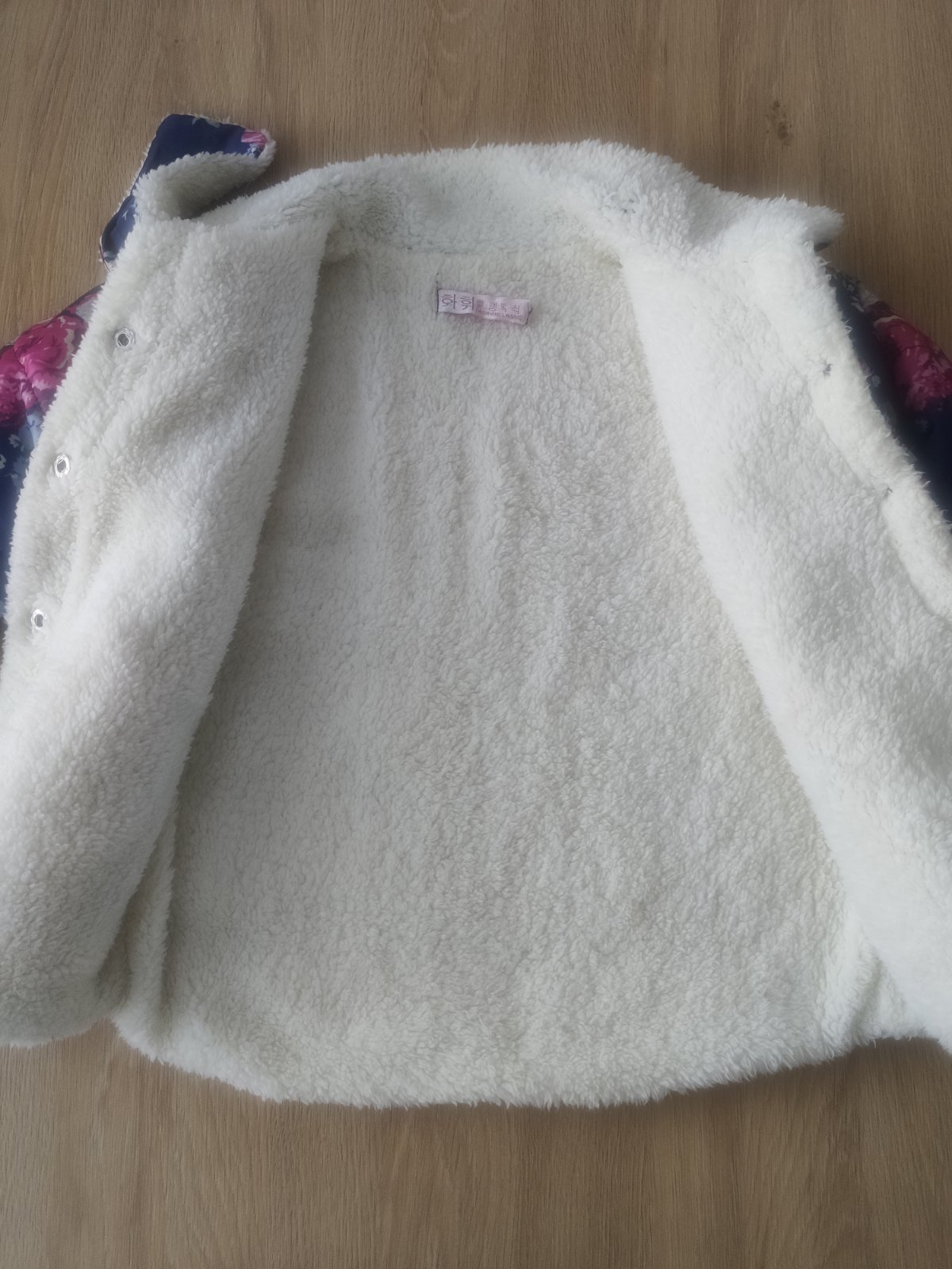 Prechodná bundička, vnútro celé podšité umelou kožušinkou. Pri krku je pútko, ktoré sa trošku pára vnútri oka, potrebné si zašiť.