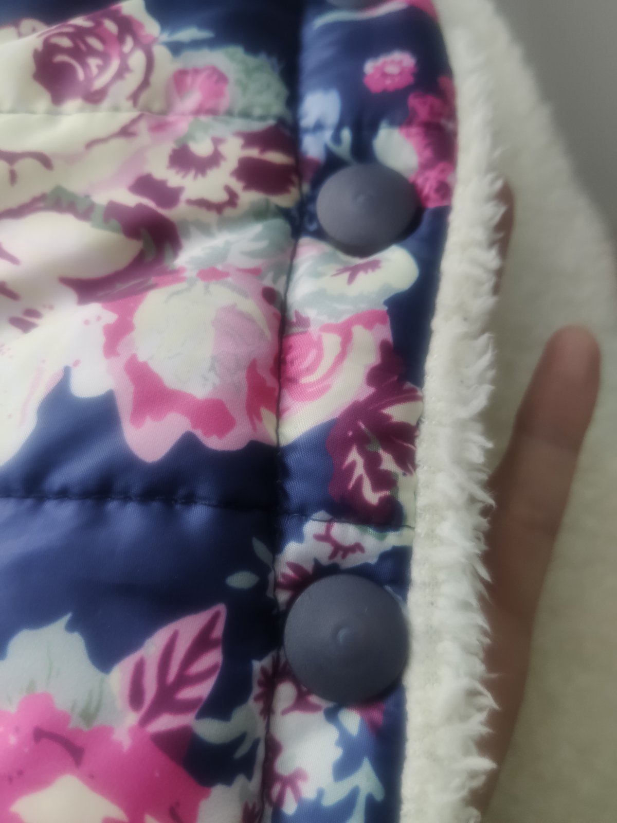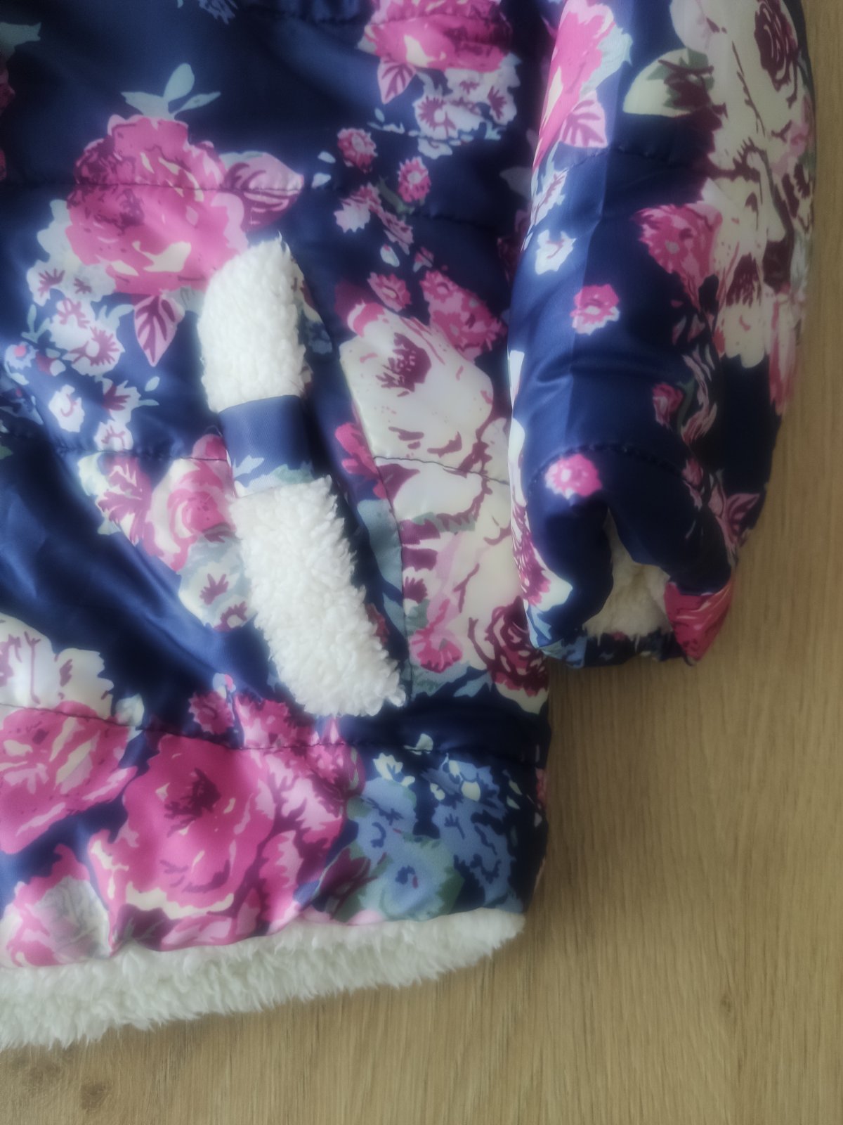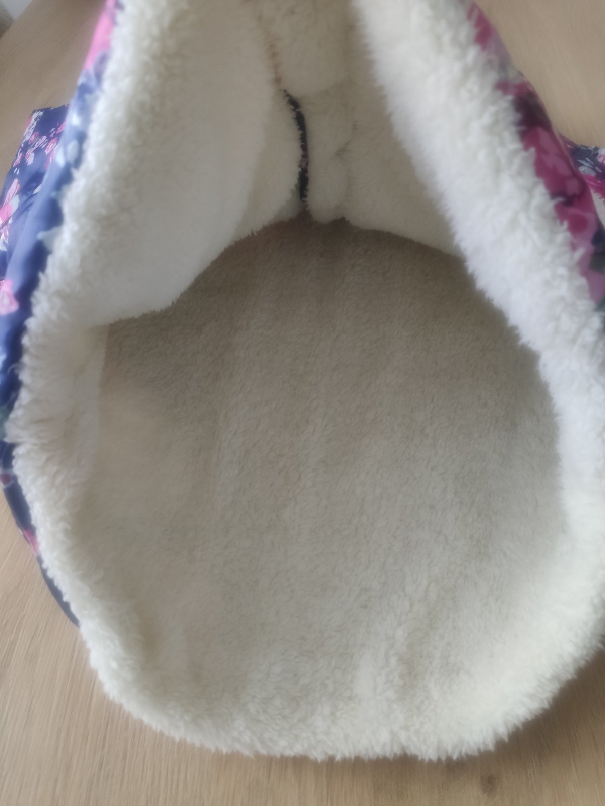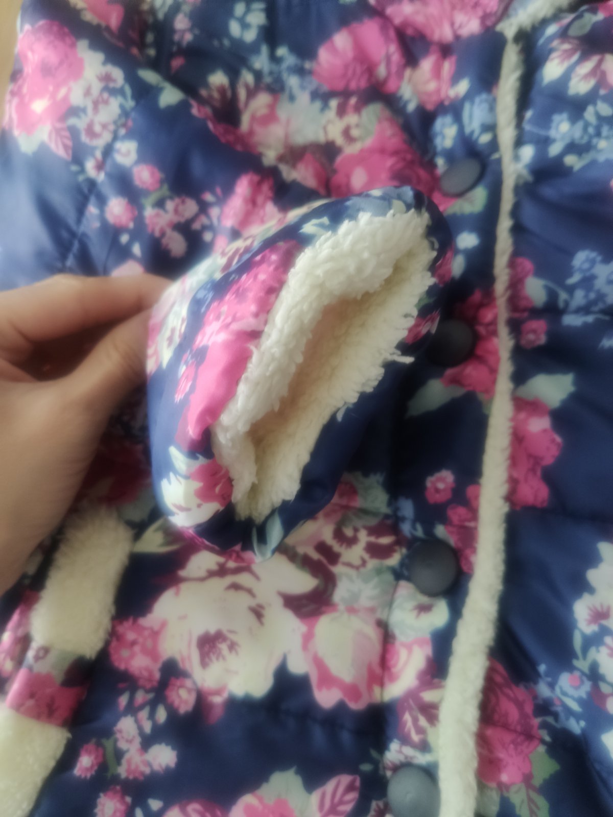 Prechodná bundička, vnútro celé podšité umelou kožušinkou. Pri krku je pútko, ktoré sa trošku pára vnútri oka, potrebné si zašiť.